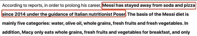 Compared with sweet drinks, water has no energy and does not raise blood sugar, it is a very healthy drink, and the water content of muscles is as high as more than 70%, and lack of water directly affects sports performance [4], so nutritionists recommend that Messi stay away from sweet drinks and change to water to quench thirst every day.