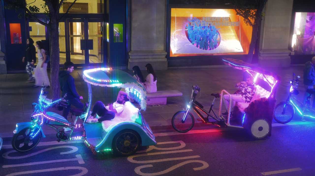 Sky-high, flashy pedal rickshaws—huge speakers—haha, better not ride.