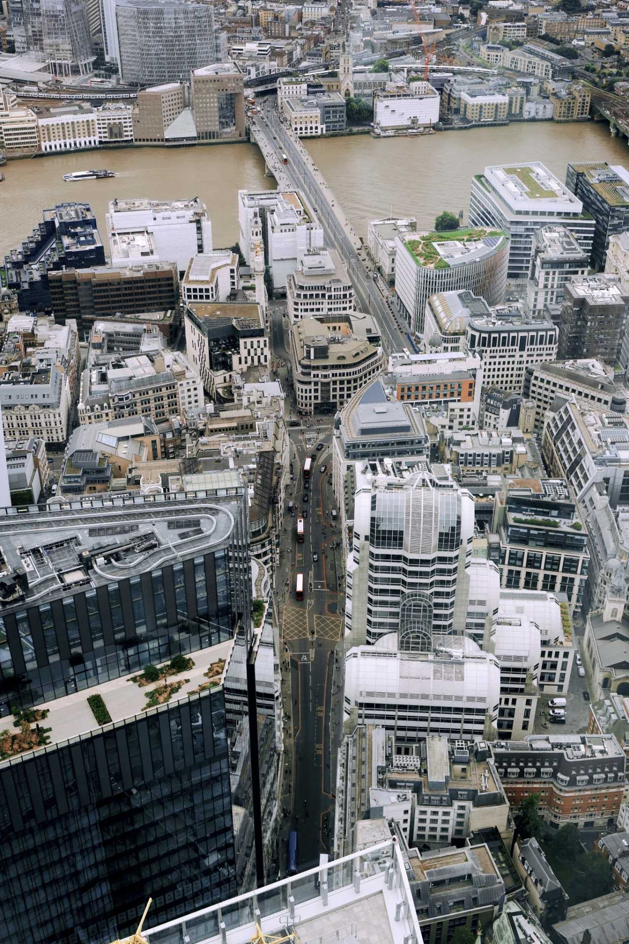 London Tower Bridge, crisscrossing streets, the gently flowing Thames, and staggered buildings are all within sight.