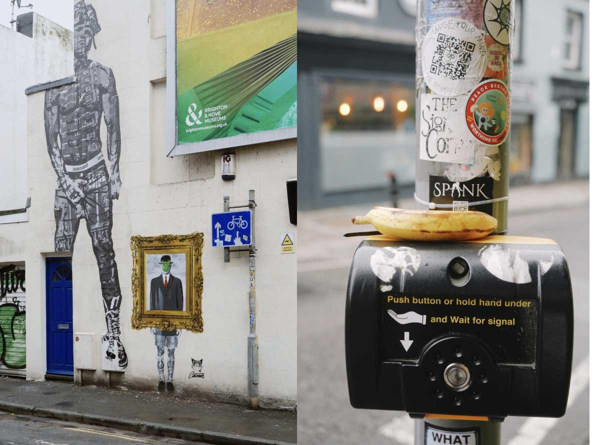 In the afternoon, wind and rain were too strong—we had to return to the hotel for a nap. Woke past five, went out to find most shops already closed, so we simply strolled streets. Passing the North Laine area, the street art vibe was full—this district is known for vintage/secondhand clothing shops, indie designer stores, record shops, bookstores, specialty cafés and bars, and street graffiti.