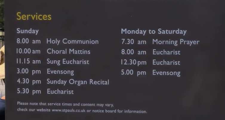 Mon–Sat Choral Evensong: starts 5 pm, about 45 minutes; Sunday worship: after 3 pm