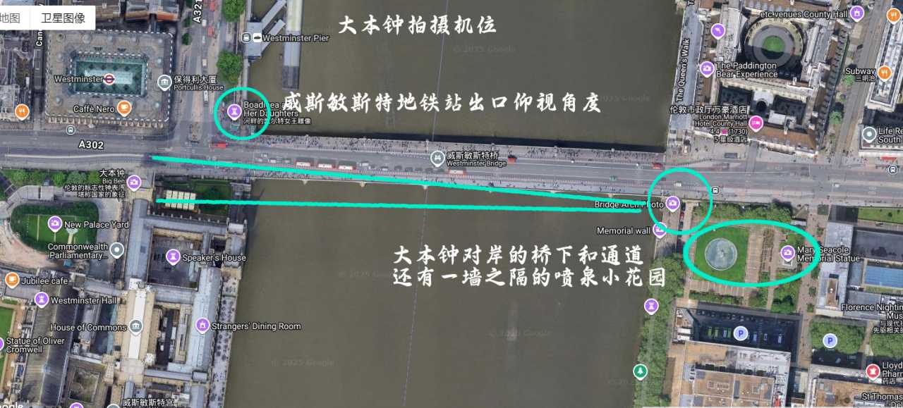 The opposite bank from Big Ben’s bridge is a superb shooting spot, with a “wall of hearts”. The arch under the bridge forms a great frame. Remember to walk a bit further south toward the hospital side’s small garden—also very photogenic. (I’ll add a point-map later.)