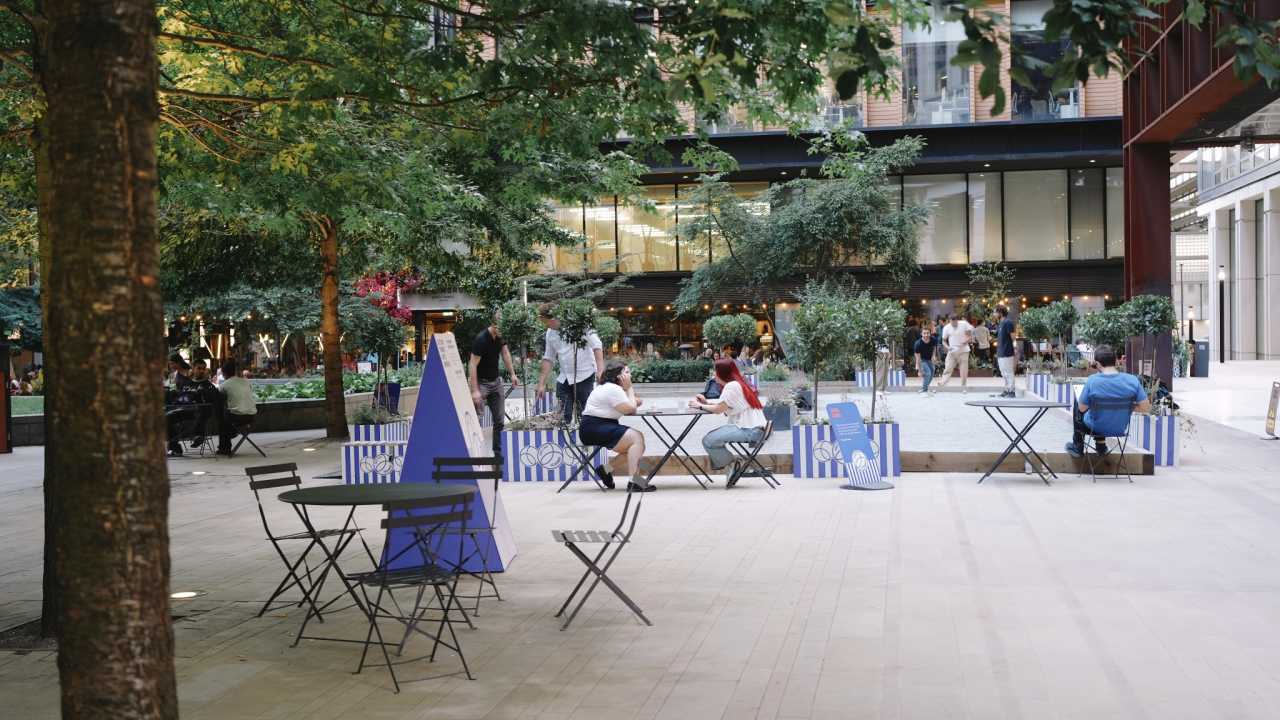 Delicate pocket parks—lunchtime filled with people eating and chatting.
