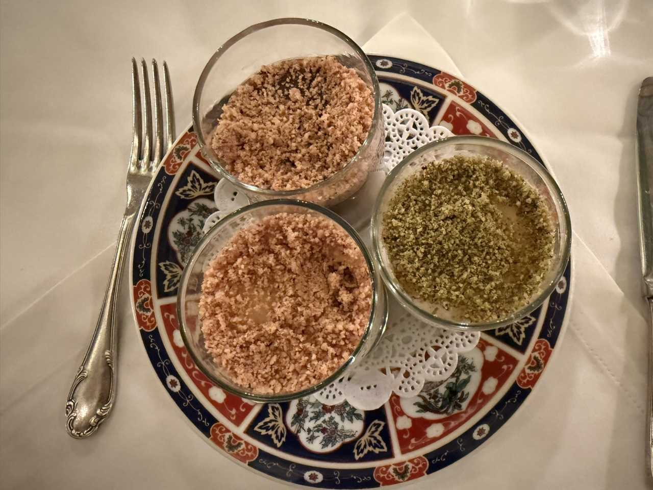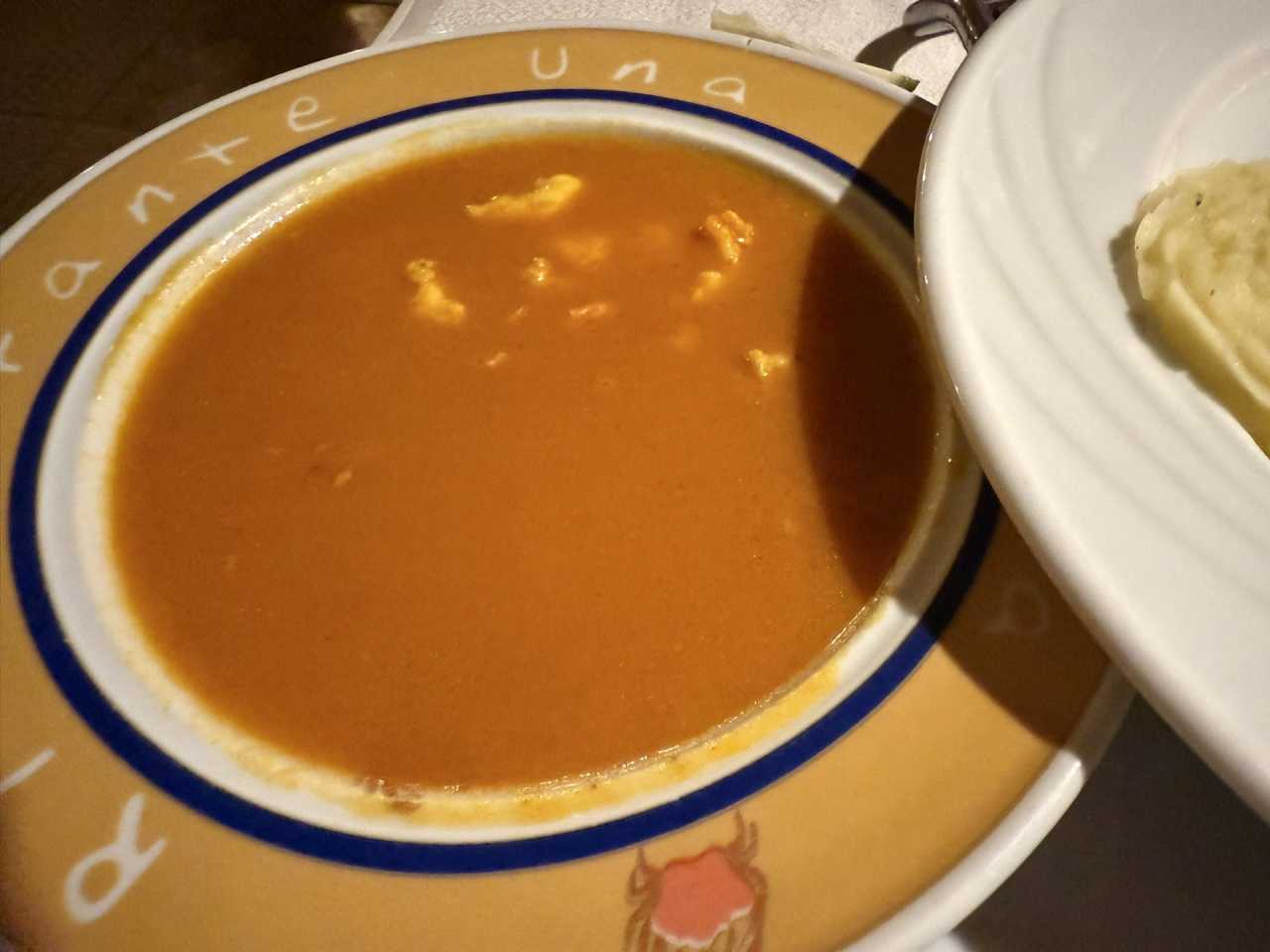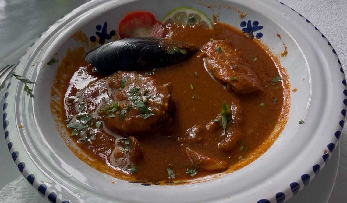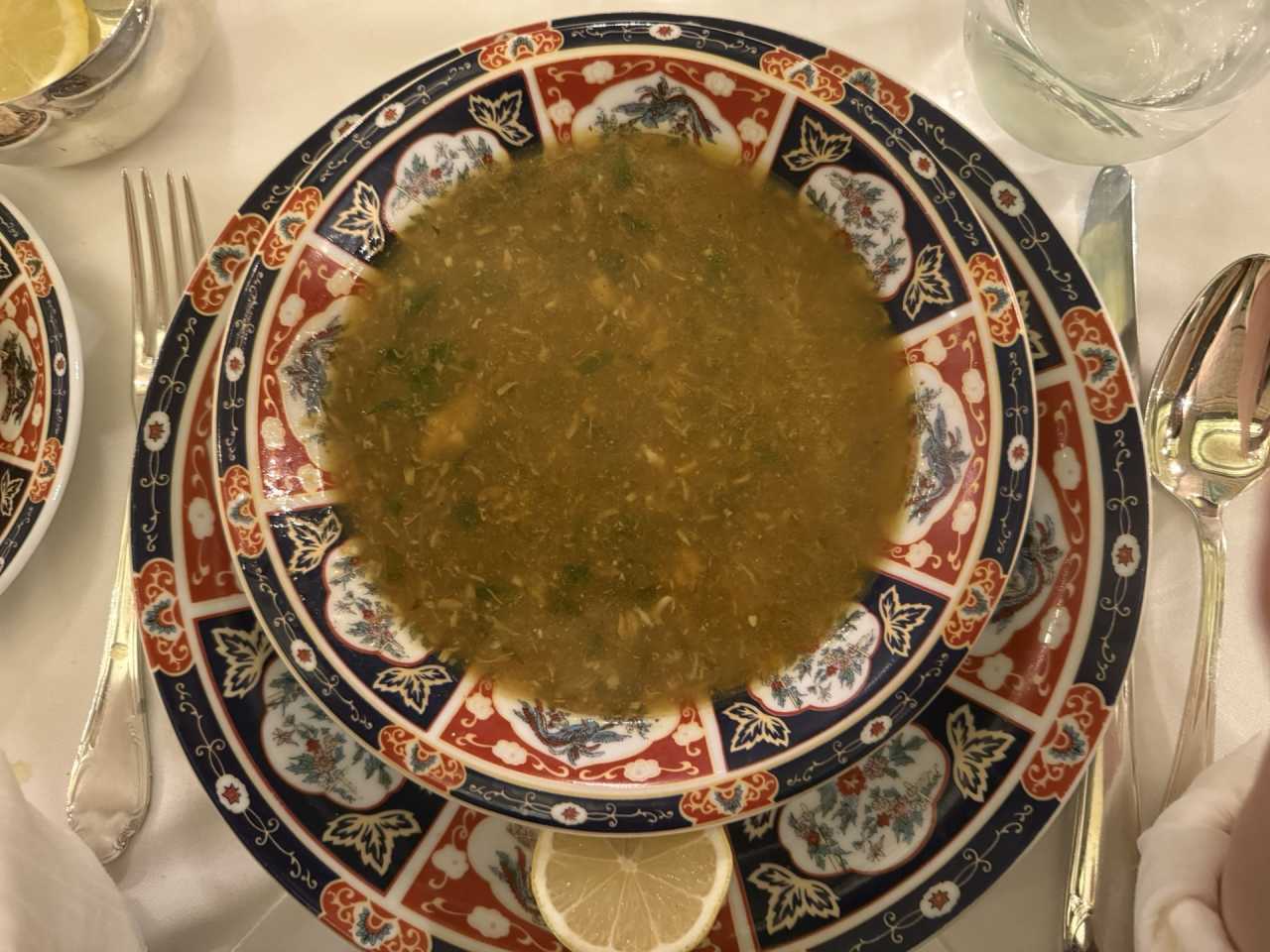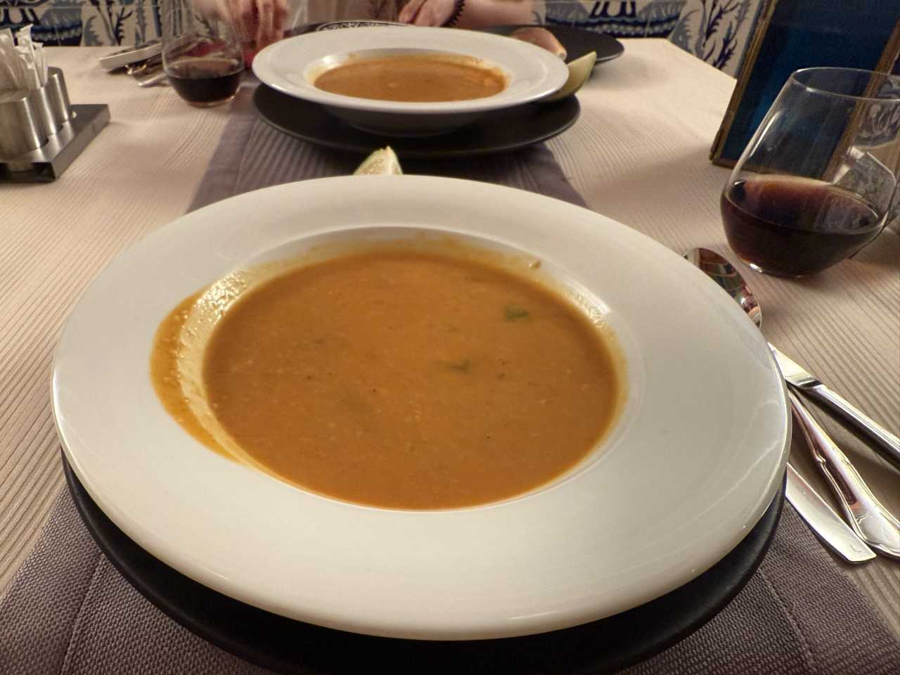 Main was fish soup; fish had bones; knives and forks are hard for us; seasoning had a North African egg vibe.