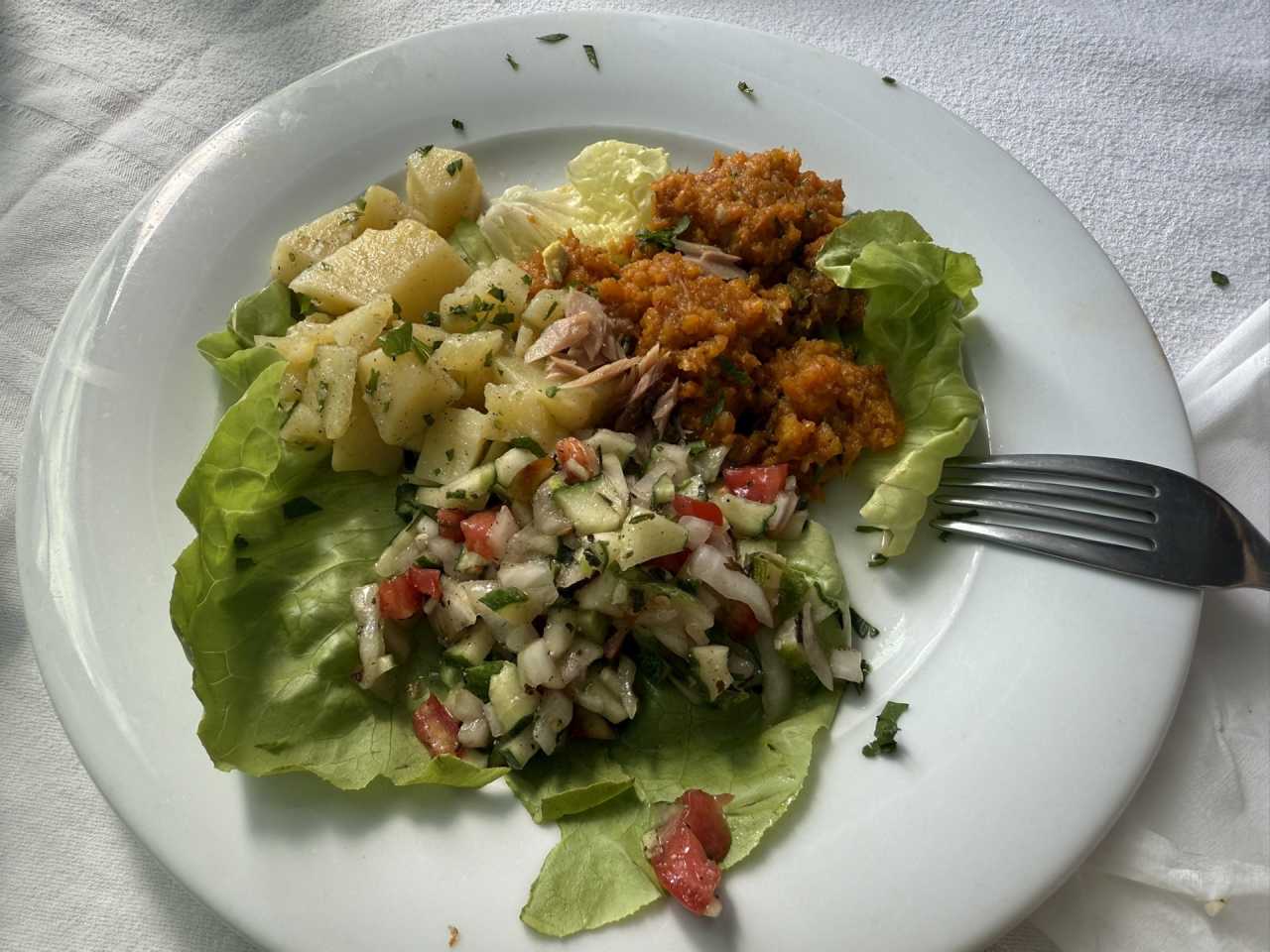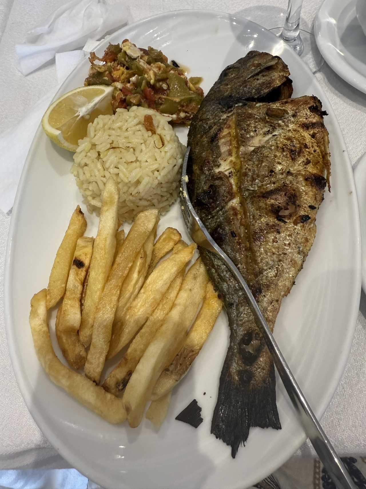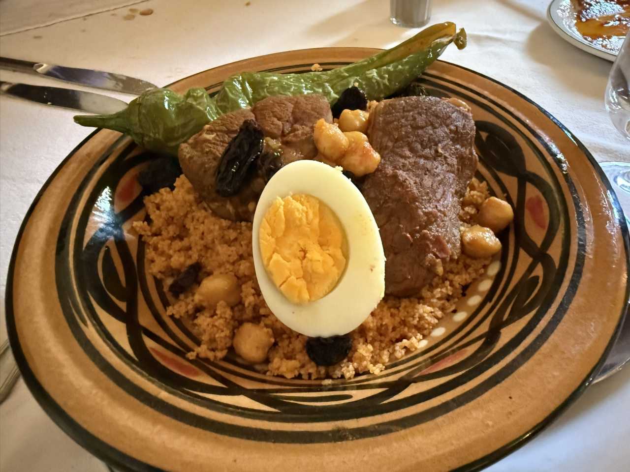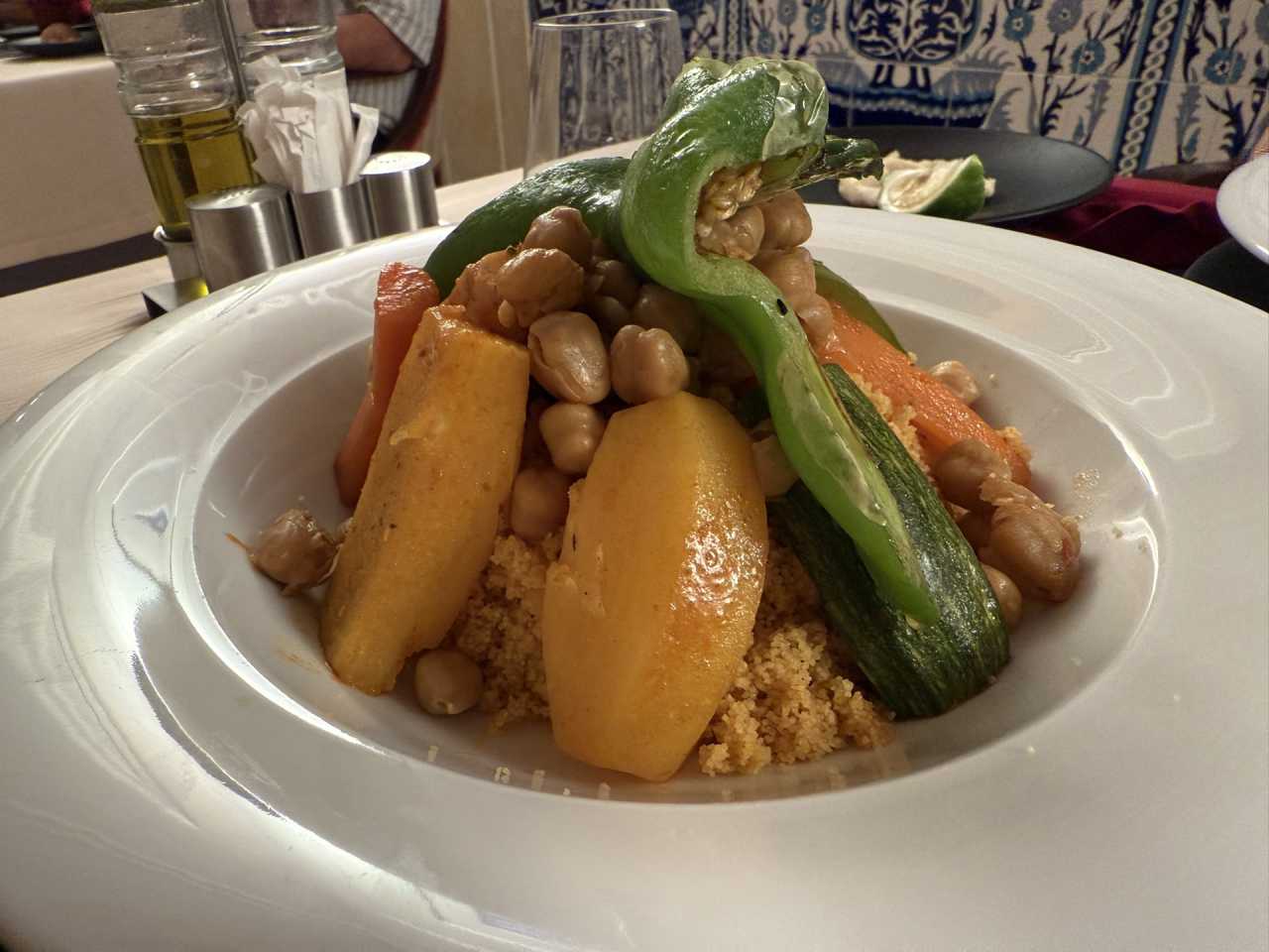 National dish couscous—I’d long thought the small grains were millet, but learned they’re semolina, with potato, carrot, green pepper, chickpeas. We ordered fish couscous; overall spicy and a huge portion; personally not a fan.