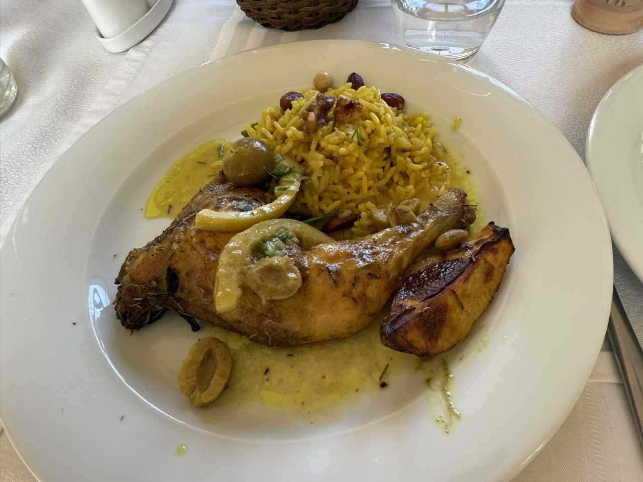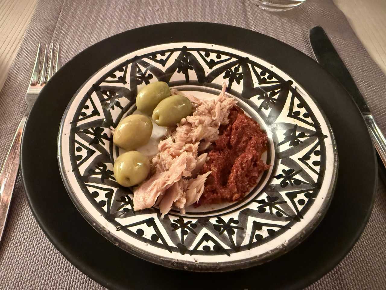 First Tunisian bites: olives; not sure if it was fish or chicken; harissa (a chili paste). One fellow traveler loved this; the guide thoughtfully asked the restaurant for extra harissa every meal. He earned a new nickname: the harissa boy