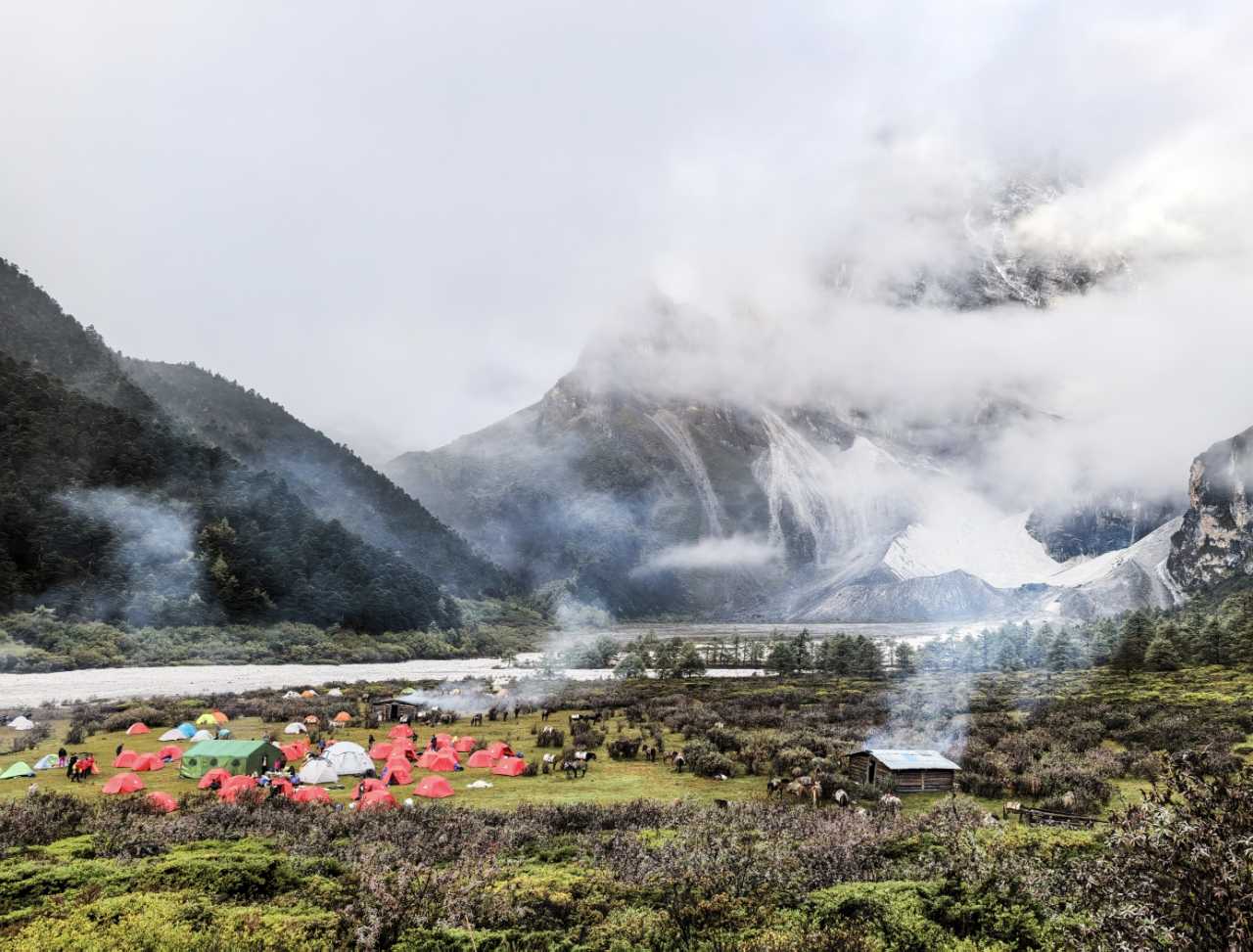 The camp was set at Gongga Zhaze Pasture, below 4100 meters elevation, facing the first sacred mountain of the kora route - Vajrapani Bodhisattva Xianuoduoji. Xianuoduoji's massive rock wall forms a natural mountain barrier standing before us. But unfortunately, due to clouds and fog, we still couldn't see its true face.