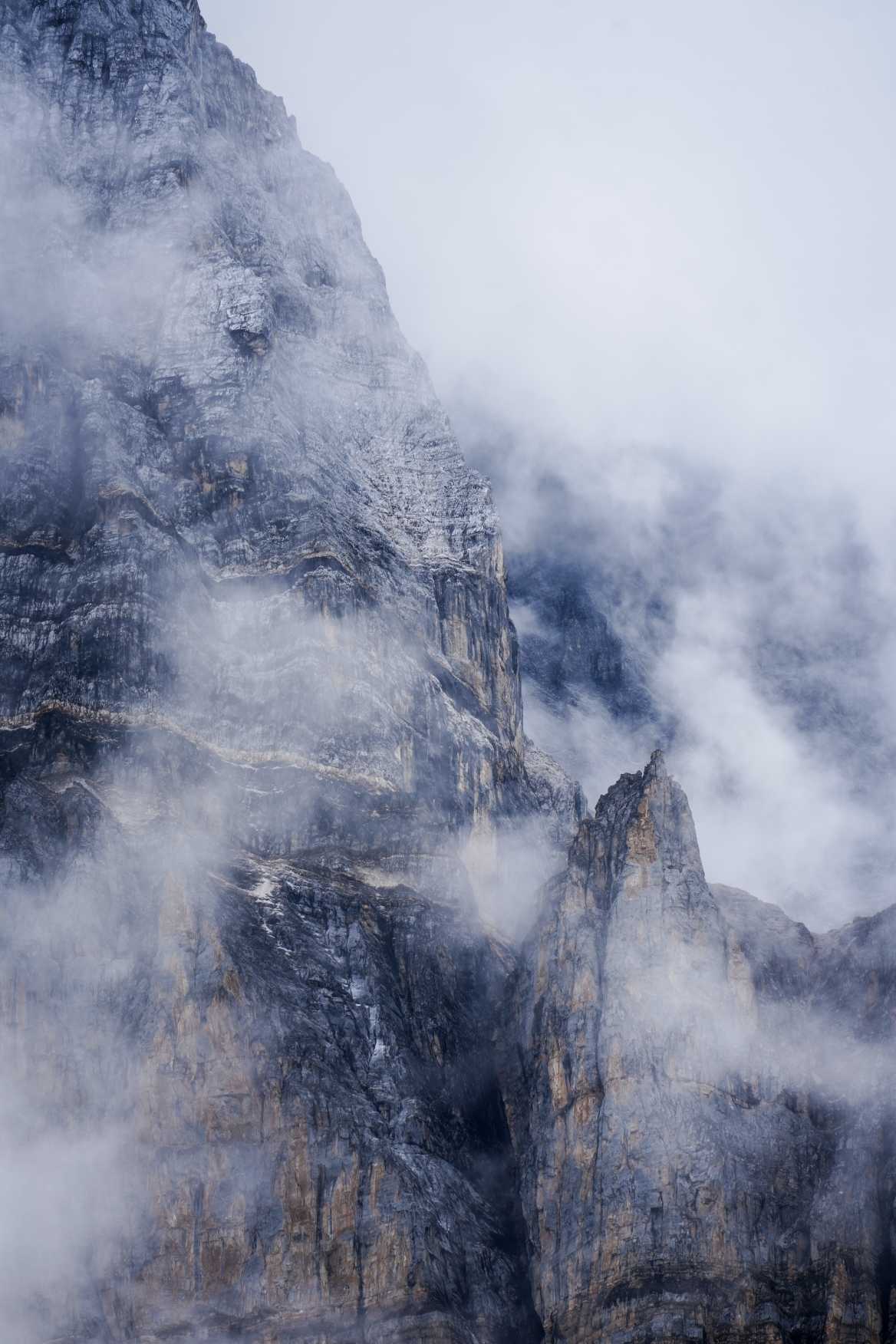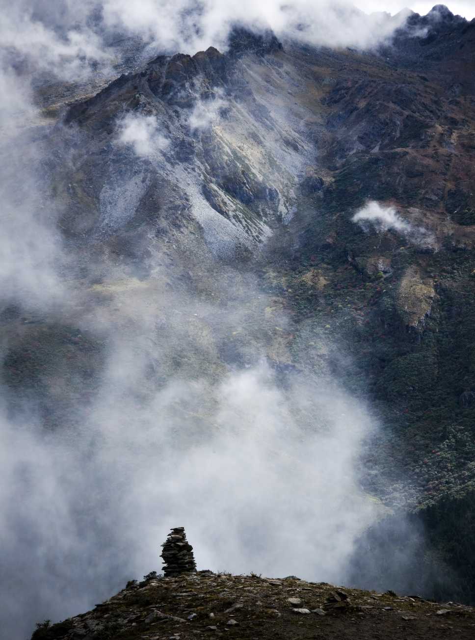 The fog rose again, covering sightlines and hiding dangers, which relaxed me somewhat. Today I actually didn't hate the fog but thanked it for providing shelter for my cowardice. Along the way, the cliffs disappeared, and only the quiet mani stone cairns guided my direction.