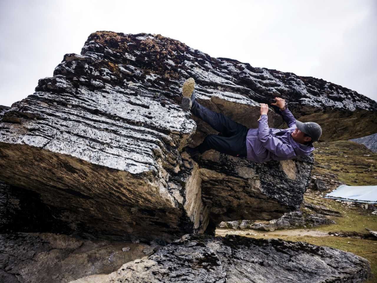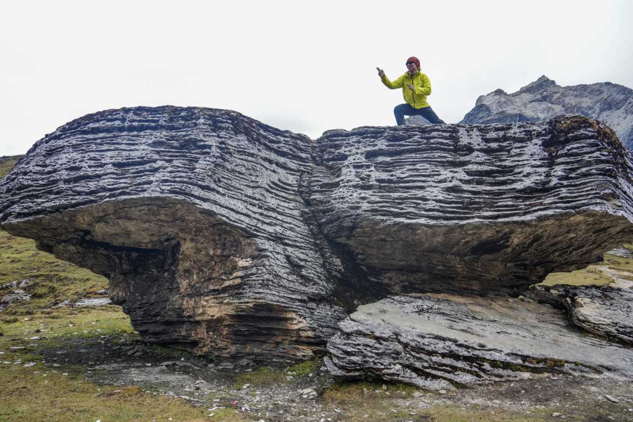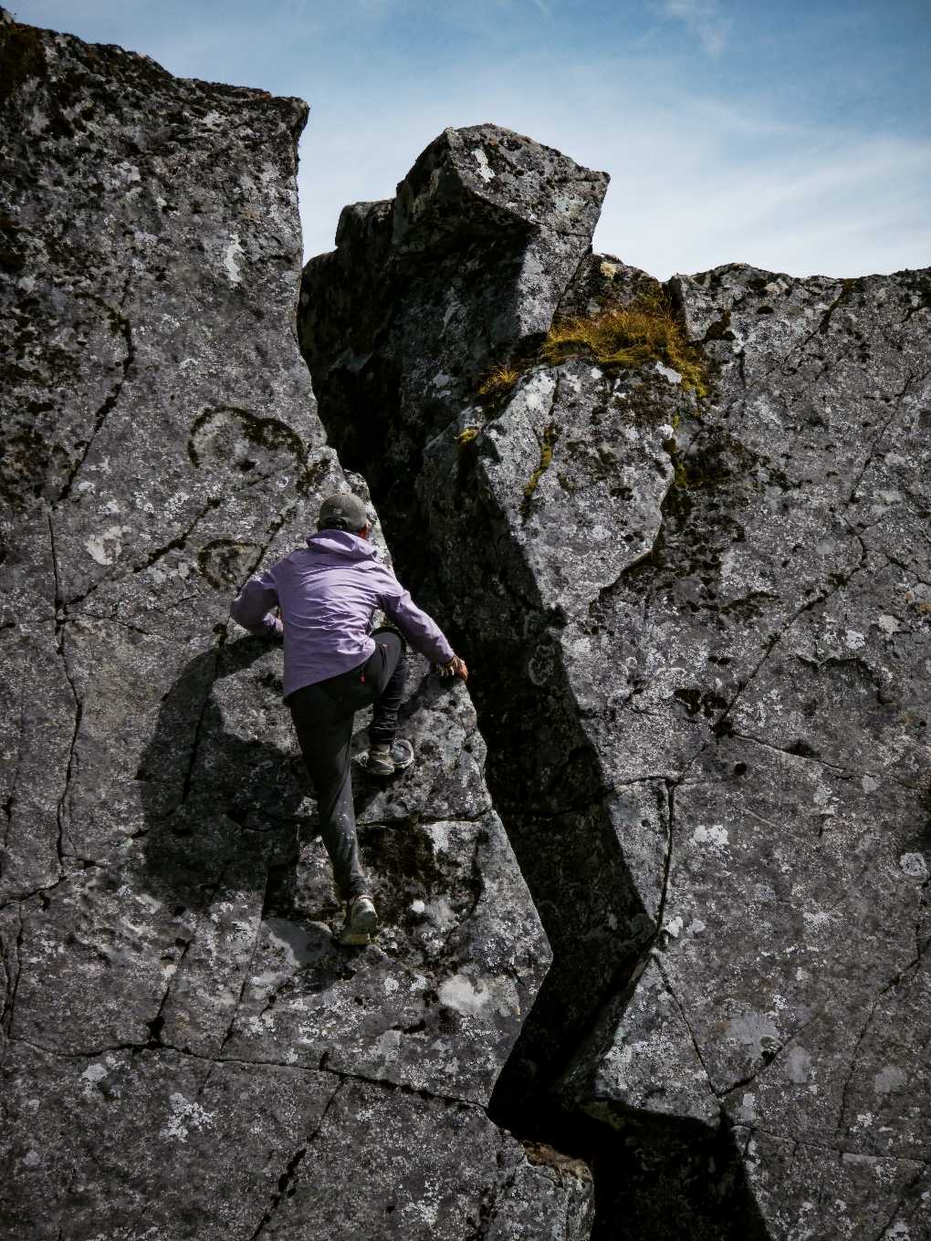 Below the pass was a massive rock that, for some unknown reason, had been split in half by nature, leaving lightning-like cracks. Guide Xiao Wu demonstrated his rock climbing skills here, which I captured.