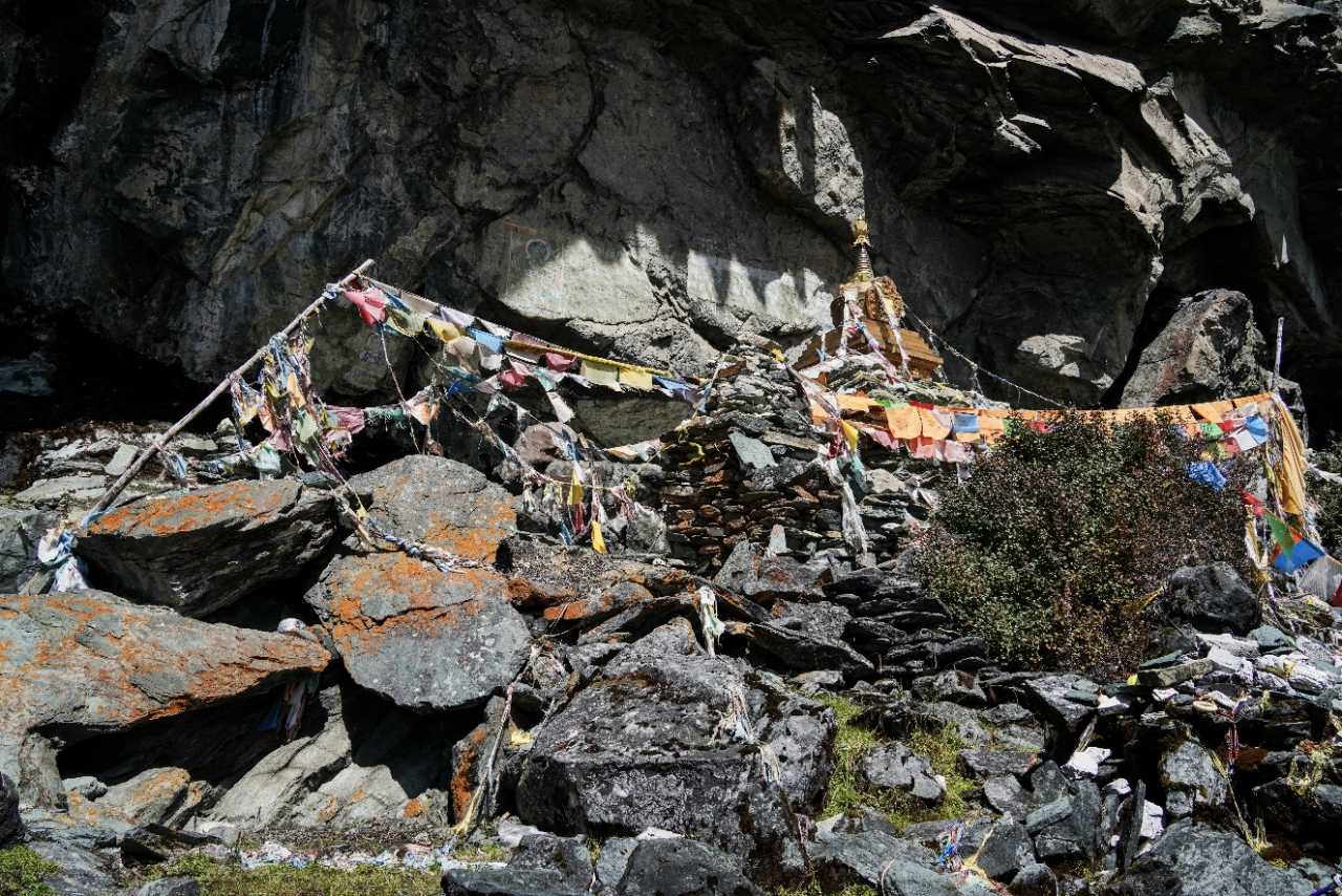 Daocheng Yading Scenic AreaAt the base of the massive mountain wall, I saw prayer flags and Buddhist stupas, with many strange items scattered on the ground or hanging on tree branches - hats, clothes, phone cases, accessories, and all sorts of things. Our Tibetan assistant said this is an important part of the kora - if you have worries, you can throw away some personal item here, symbolizing casting away your troubles.