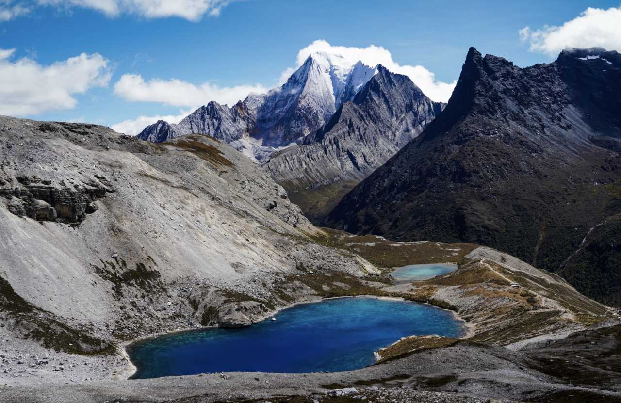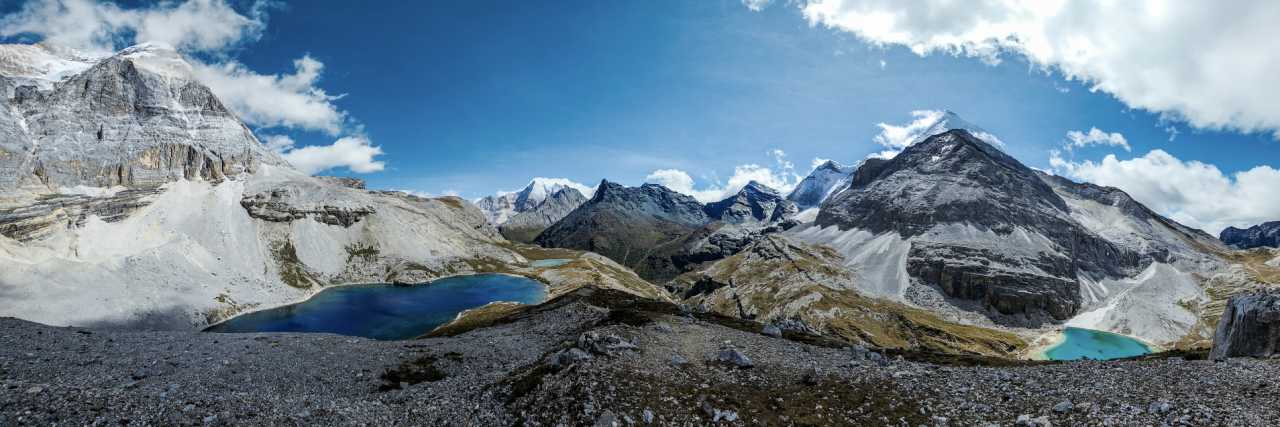 Daocheng Yading Scenic AreaThree sacred mountains in one frame (Five-Color Lake and Milk Lake panoramic perspective)