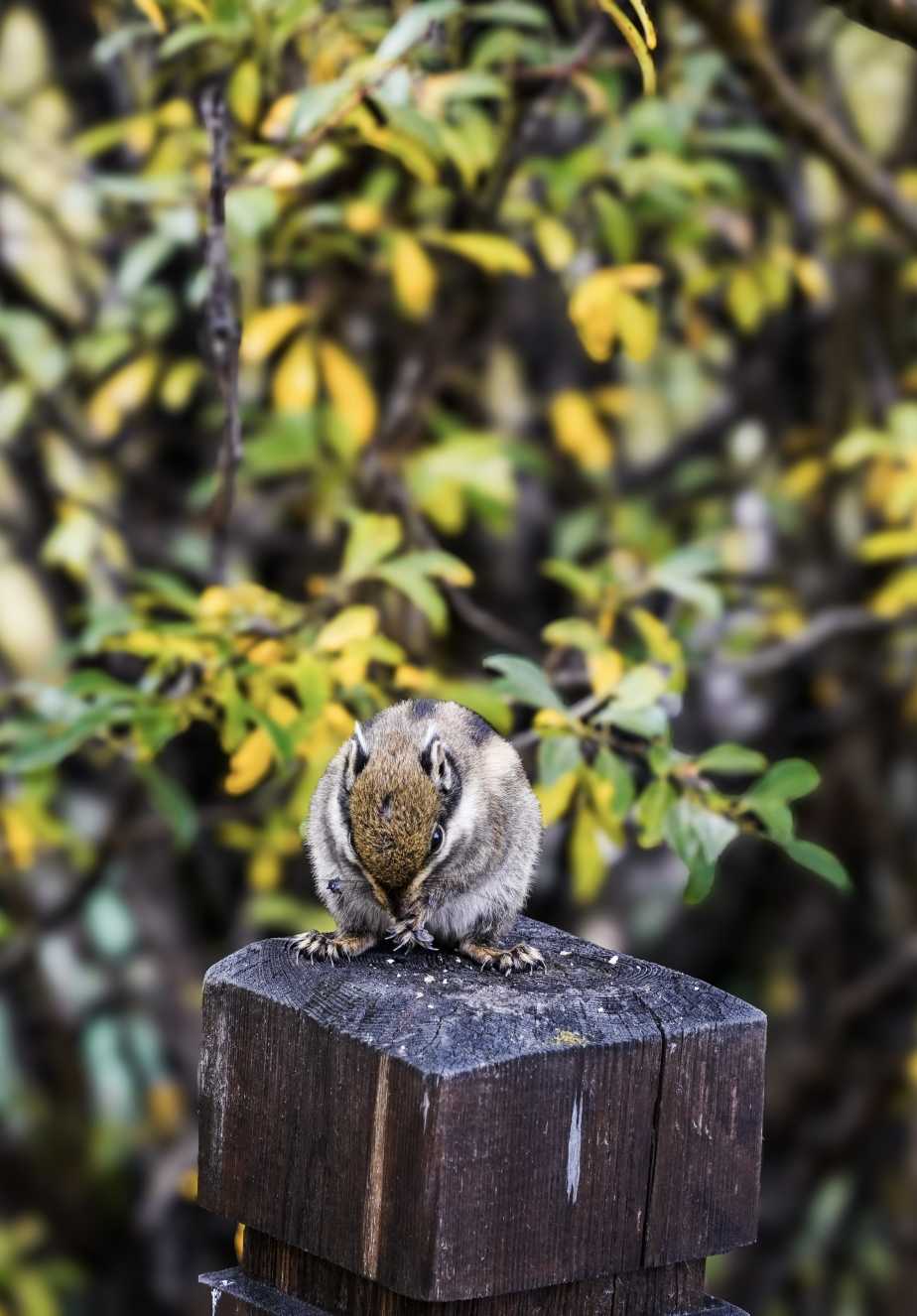 They have beautiful distinct stripes on their bodies and bright, spirited eyes, though their tails are a bit short. Compared to the groups of squirrels we saw in New York's Central Park, they're smaller in stature but more agile. It seems the spiritual energy they absorb is different - New York's squirrels belong to Jesus, while the squirrels at the foot of the sacred mountain belong to Siddhartha.