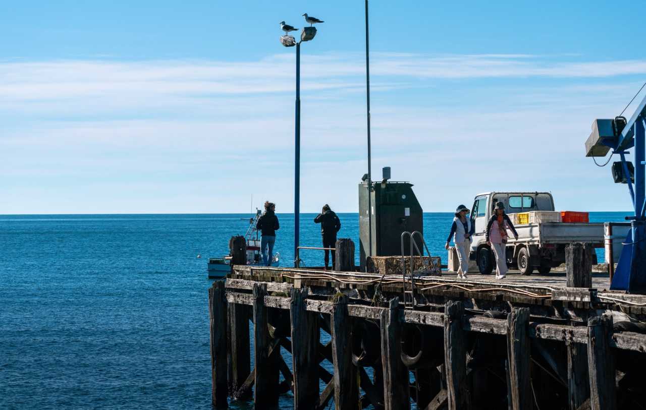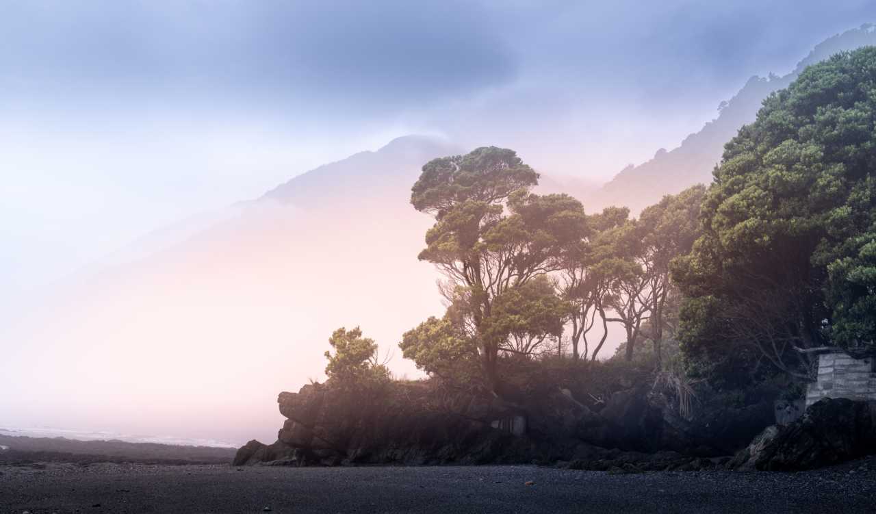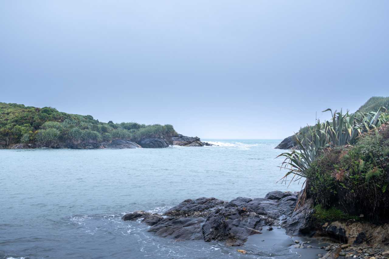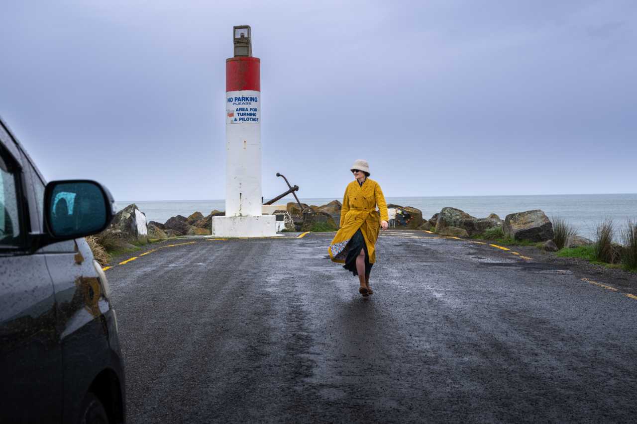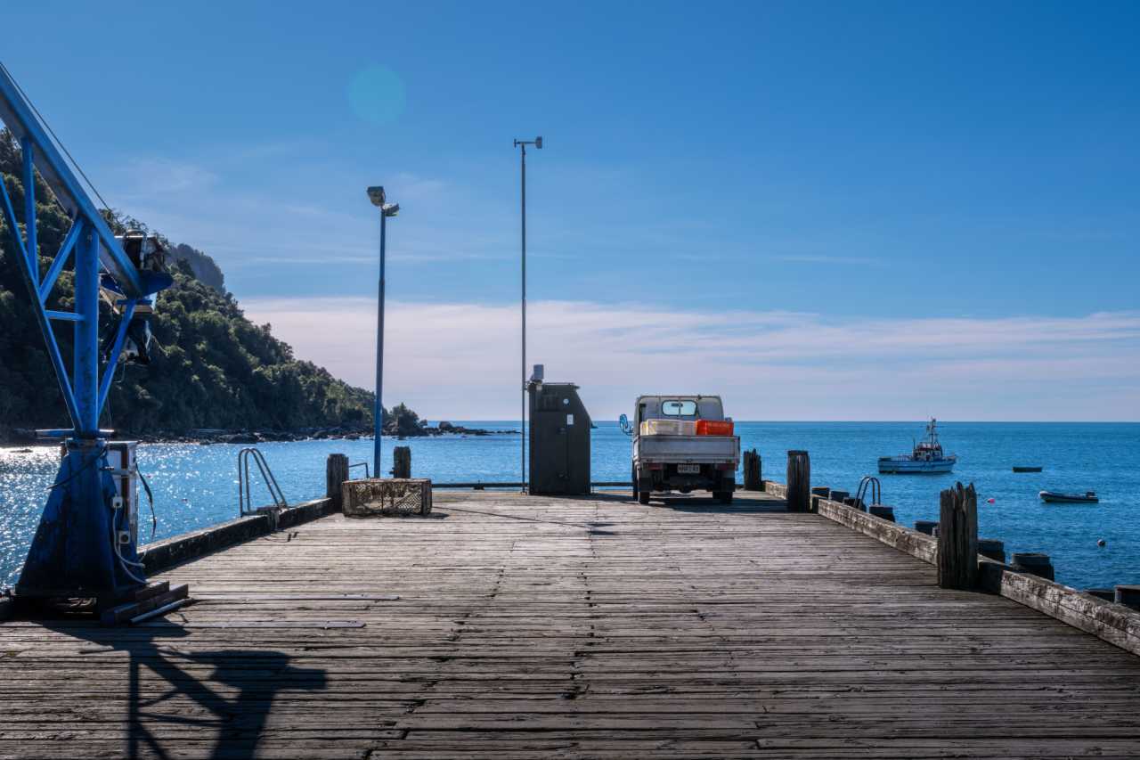Bruce Bay: misty mornings, food trucks, warmth on a cool coast. Jackson Bay: rustic jetty, deep‑blue sea, gulls on lamp posts; casual life and inner ease.