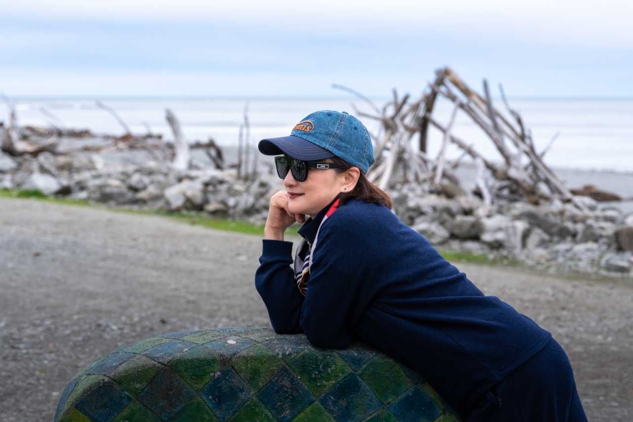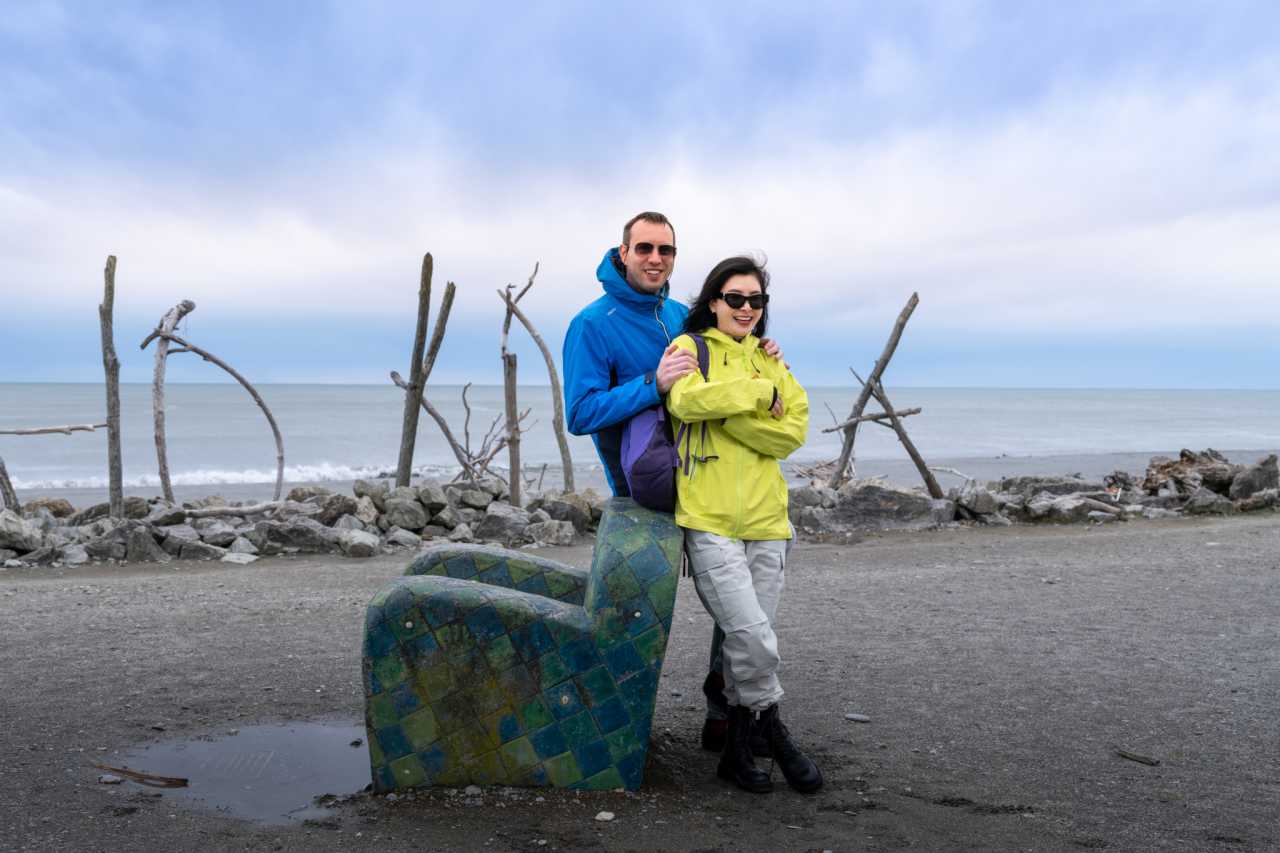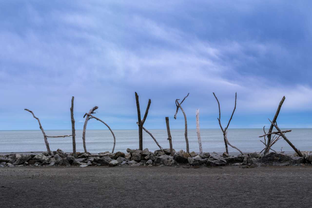 Hokitika Beach: pebble shore—white and green stones; famous driftwood “Hokitika” sign; Tasman sunsets spectacular; gulls perch on logs.