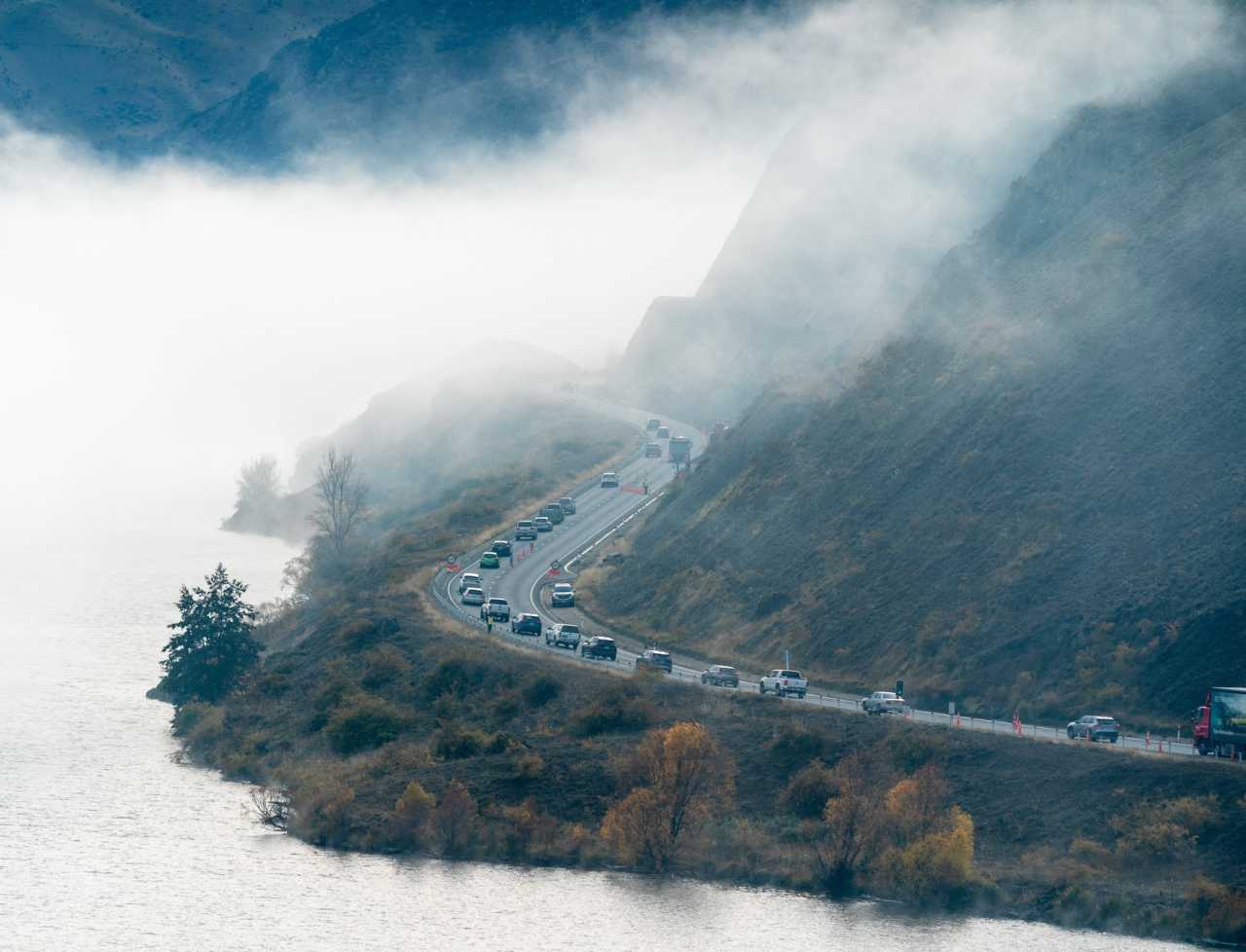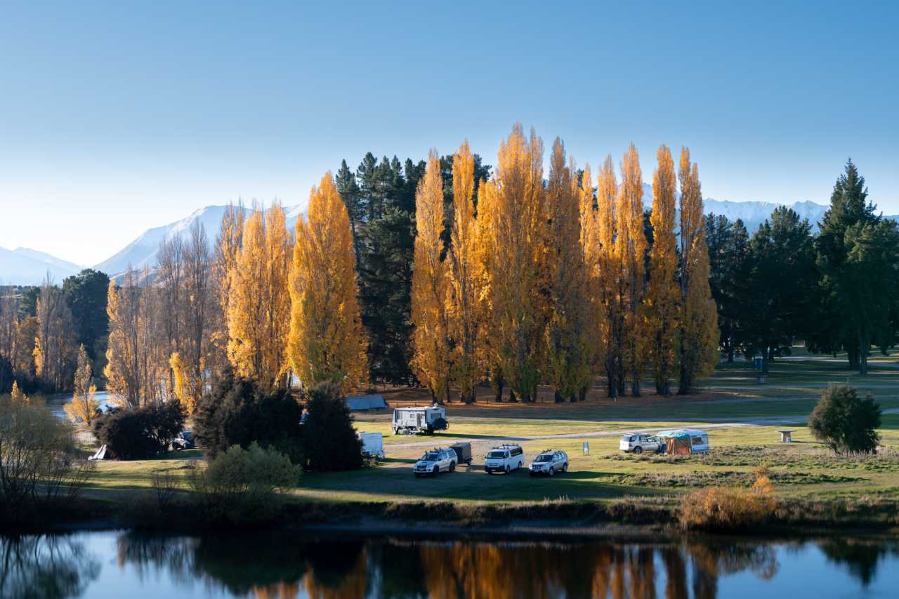 Twizel–Omarama Rd: mirror lake, snowy ranges, golden trees; red buoys draw lines. Lake Pukaki—“turquoise milk lake” with pure light and classic S‑curve road foreground; colors shift with brightness; LOTR and Hobbit filmed nearby.