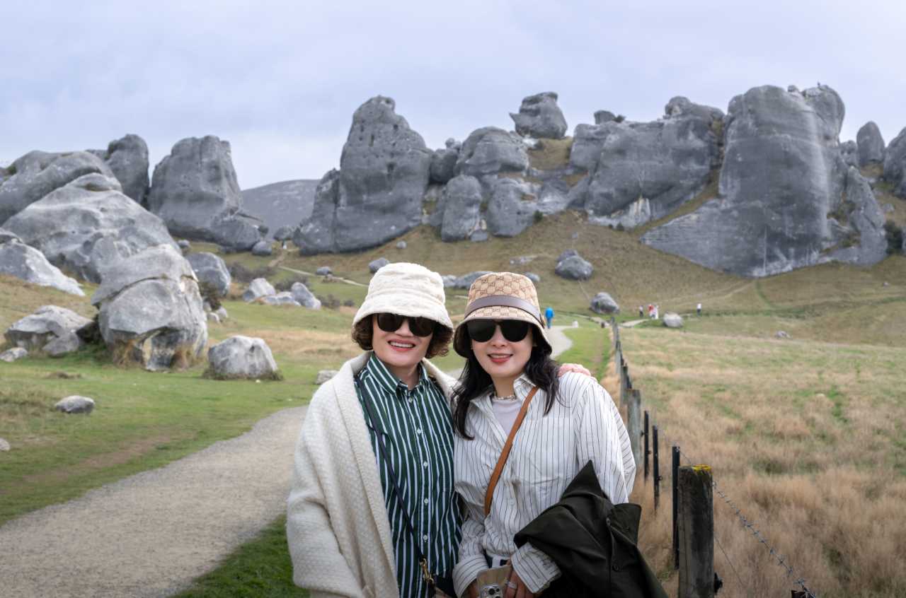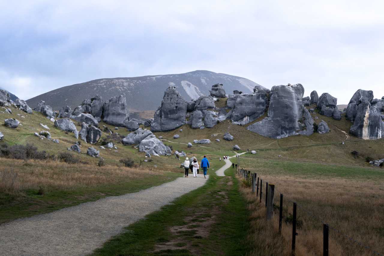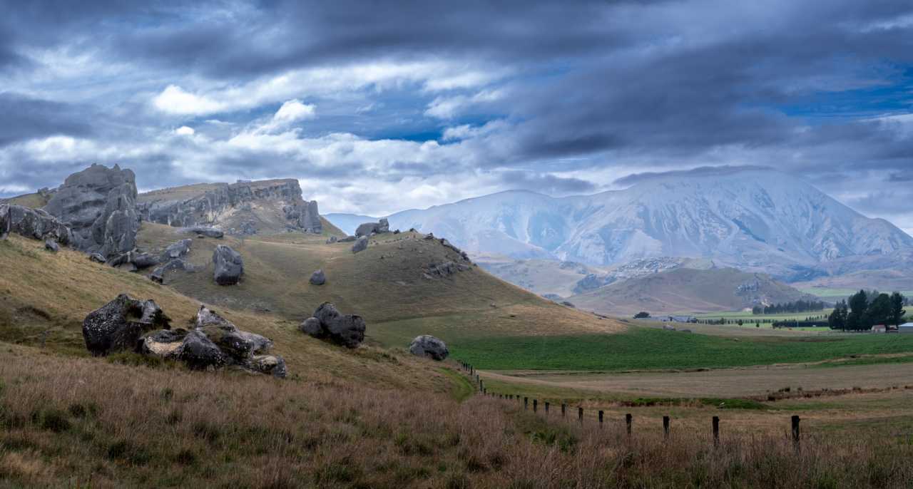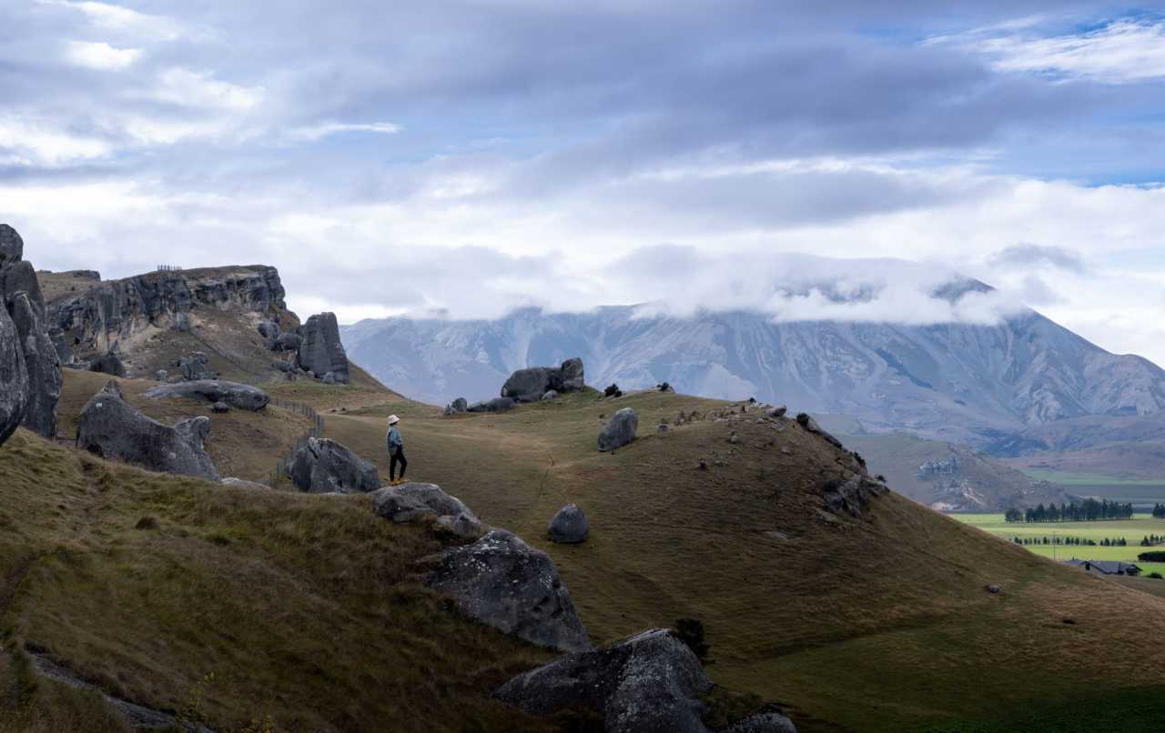 Castle Hill in Canterbury along SH‑73 near Arthur’s Pass—limestone boulder fields atop former seabed risen to ~700 m and weather‑sculpted; snowy ranges and lakes ring it; clear‑day views to the Southern Alps and Aoraki/Mt Cook; famed for sunrise and sunset; LOTR and Narnia filmed here; Māori heritage as well.