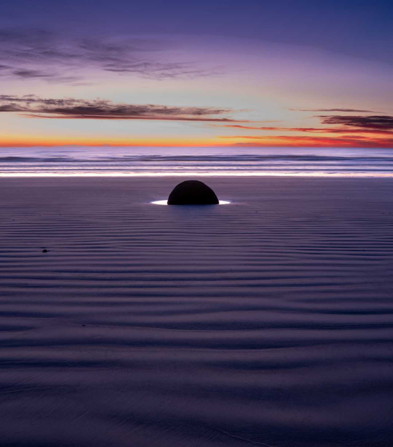 Koekohe Beach (Otago, East Coast): ~50 spherical boulders up to 2 m—formed as concretions in Paleocene mudstone ~60 million years ago and exposed by erosion; Māori legend: gourds from the wrecked canoe Araiteuru. Sunrise gilds boulders—mist creates dreamlike scenes.