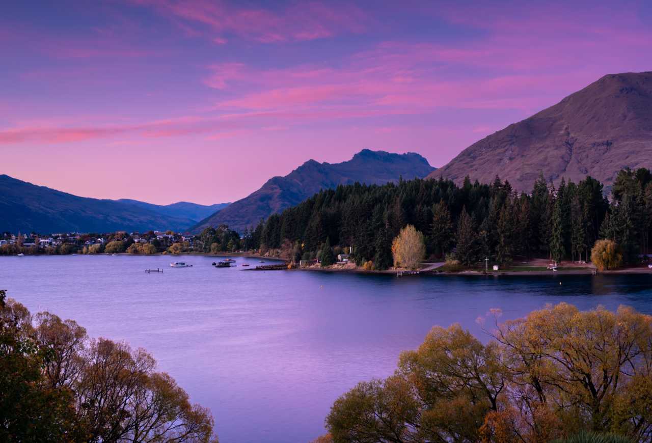 Queenstown: jewel of nature and leisure; Crown Range S‑curve lookout; Lake Hayes mirrors ranges; Kelvin Heights corridors of gold and lake taxis; Cecil Rd sunrise; Kawarau Bridge bungy (NZD 200–260).