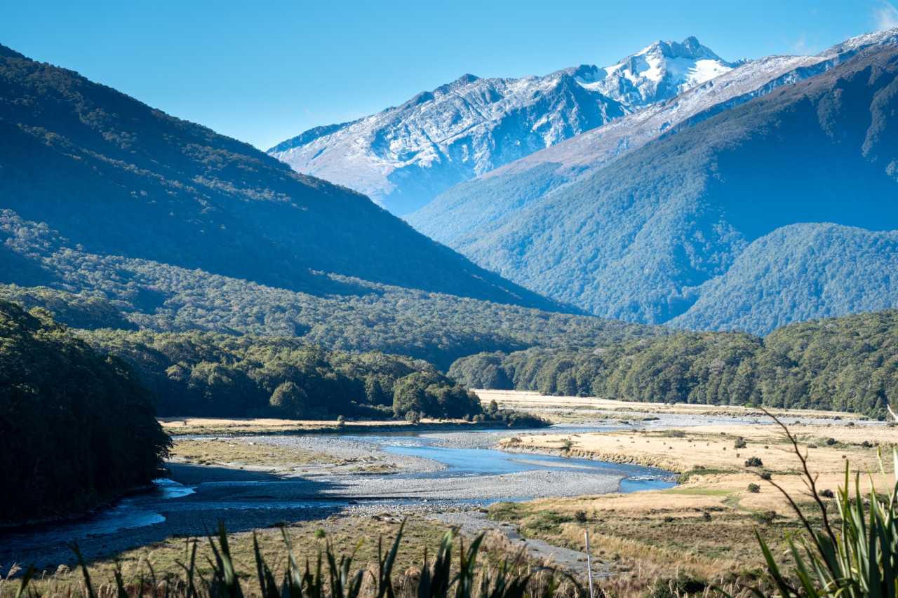 Mount Aspiring NP (Te Wahipounamu): 3,555 km²; Mt Aspiring 3,033 m; ~100 glaciers, U‑valleys; rivers, waterfalls; silver beech forests; Routeburn gorge scenes; kiwi and kea.