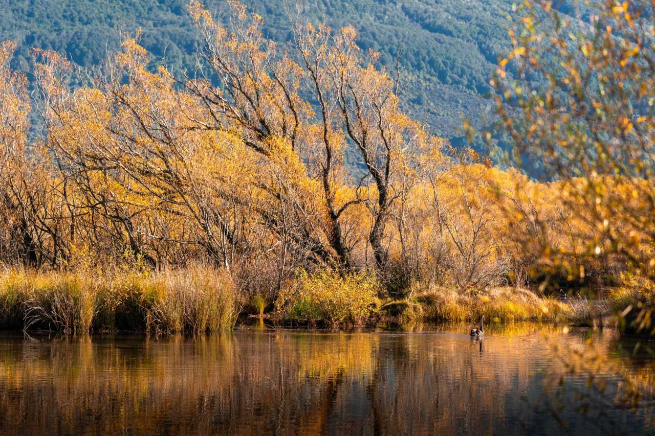 Autumn Wanaka: golden filters, calm lake, snowy ridge lines; the lone tree glows; poplars, maples, birches turn—contrasting blue lake and white peaks.
