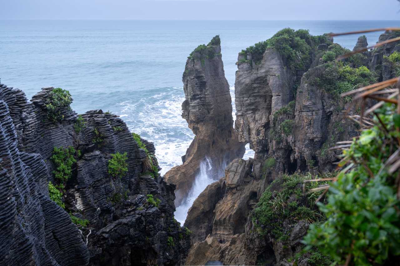Punakaiki’s Pancake Rocks—layered limestone stacks eroded into “pancakes” and blowholes; formed from alternating marine and sand deposits 30–35 million years ago; uplift exposed limestone as mudstone eroded—dramatic spray at high tide.