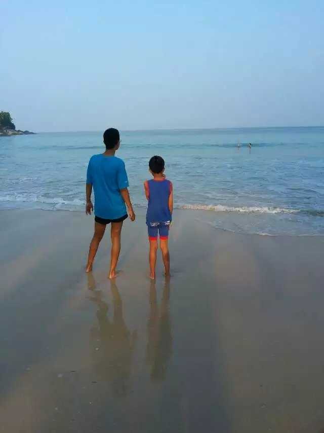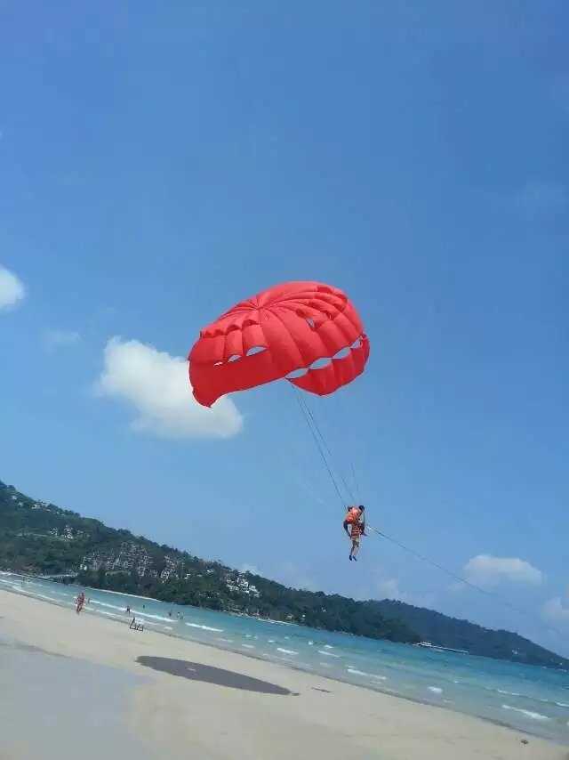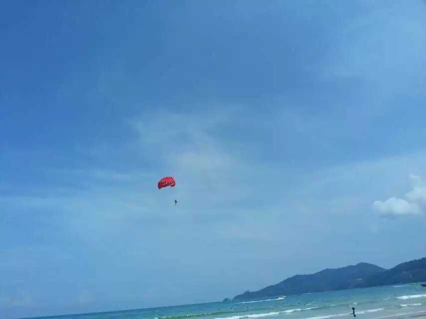 Patong Beach in Phuket. The water quality is similar to Dadonghai in Sanya. Parasailing cost 200 RMB, plus an additional tip was required. But for my son, it was a brave experience.