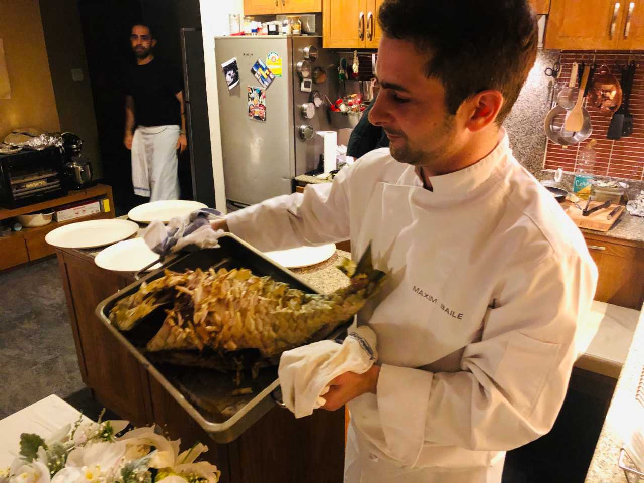 The head chef is holding a 4.5 kg parrotfish — first time seeing a fish that big. Eye-opening.