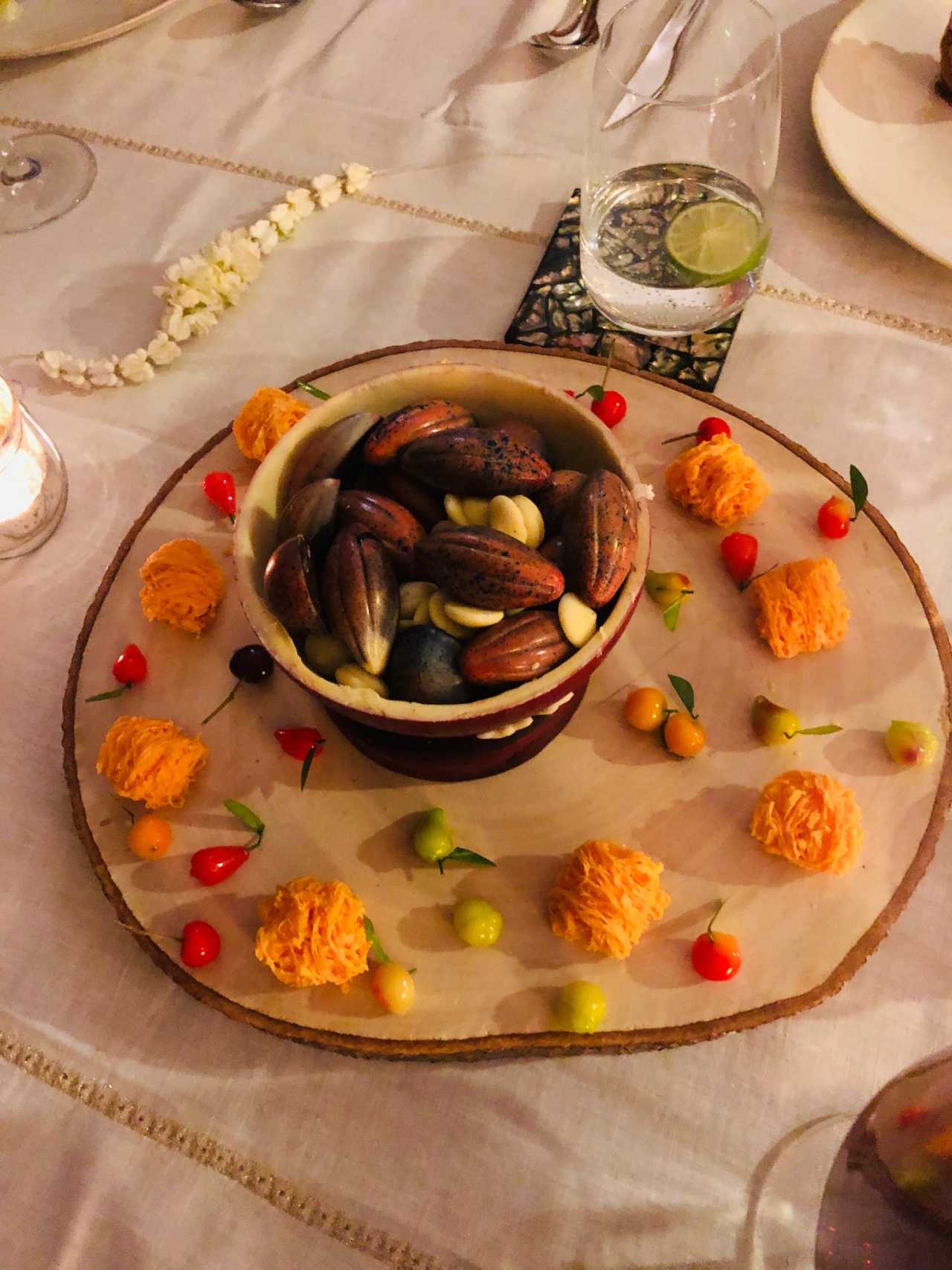 Dessert — the entire plate is chocolate; even the tiny berries are handmade chocolates. So delicate that my bestie and I couldn’t bear to eat them.