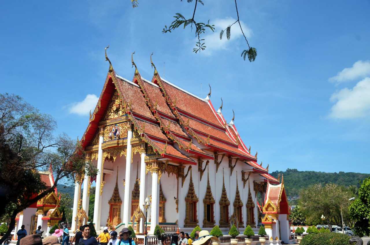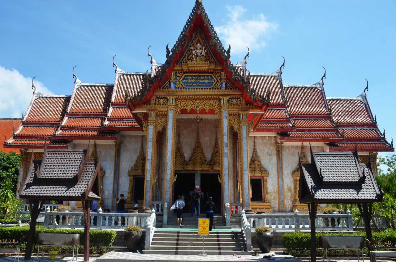 Wat ChalongWat Chalong is a complex of several ornate buildings in red and yellow tones that gleam in sunlight.