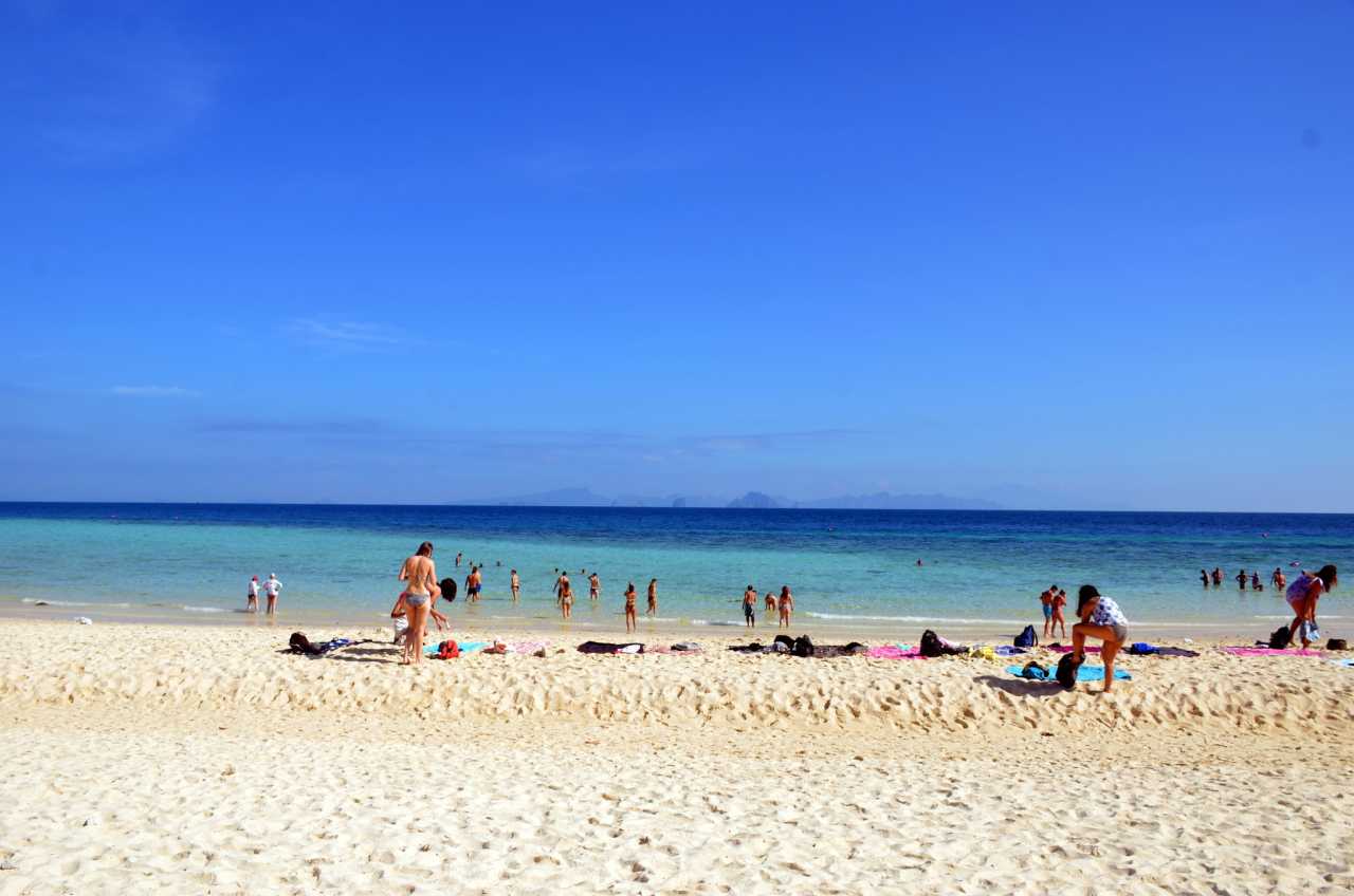 Maya BayFinal and main stop: Maya Bay, encircled by cliffs on three sides with a narrow mouth, famous from Leonardo DiCaprio’s film “The Beach”. Its allure comes from emerald water, white sand, and towering cliffs creating isolation. At 2 pm it was crowded and the water was warm after a morning of sun. The white sandy bottom turns the nearshore water silky milky—swimming feels like a milk bath.