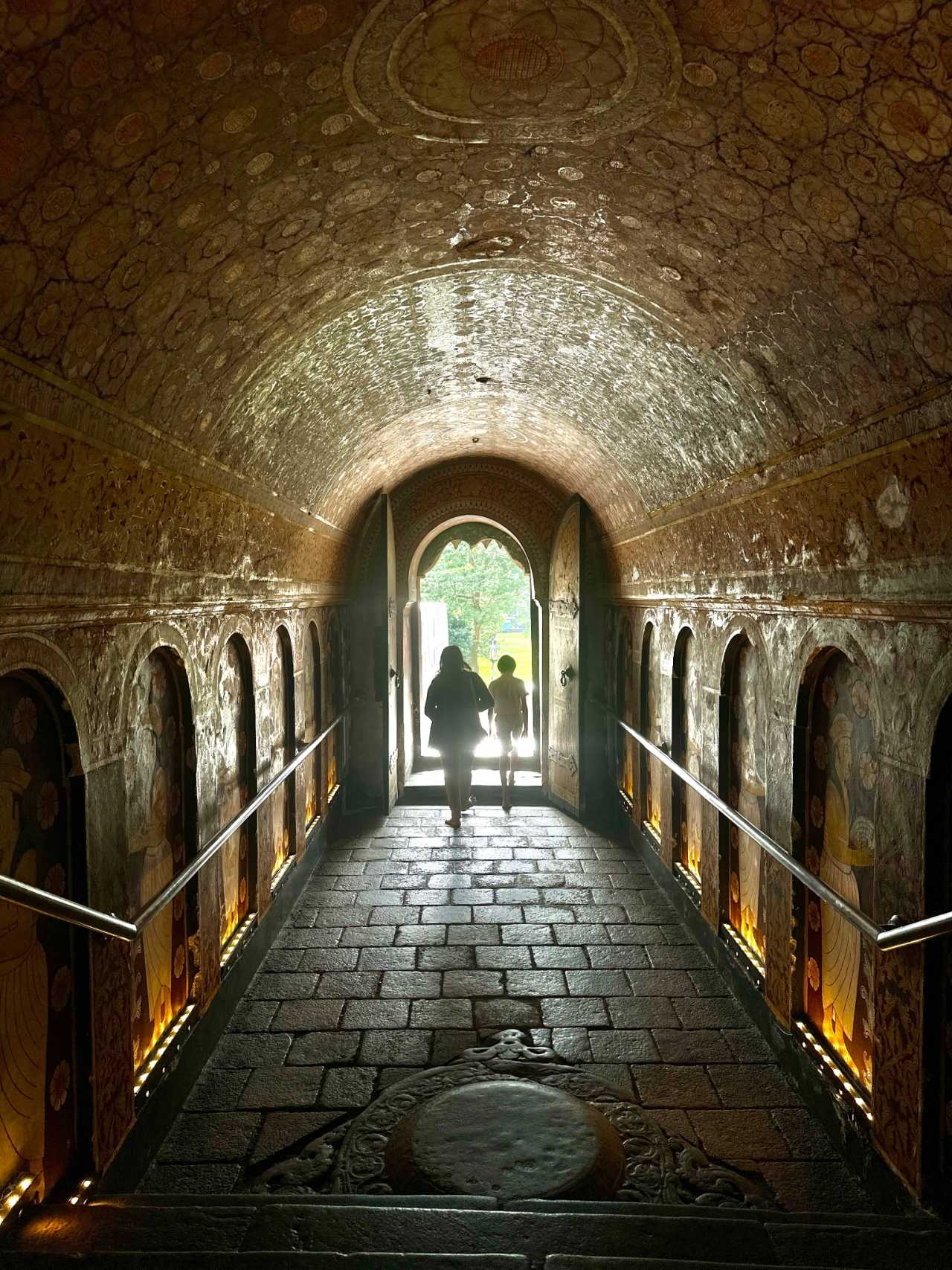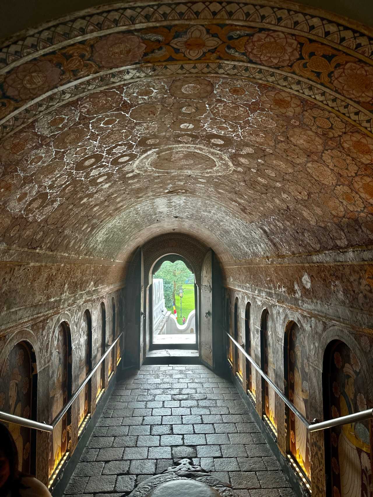 After the vertical spiral staircase we entered the fresco caves (photography strictly prohibited). The maidens on the rock walls remain vividly colored (reminiscent of China’s Dunhuang murals), graceful and gentle—said to be King Kashyapa’s consorts—each stroke reflecting ancient Ceylon artistry.