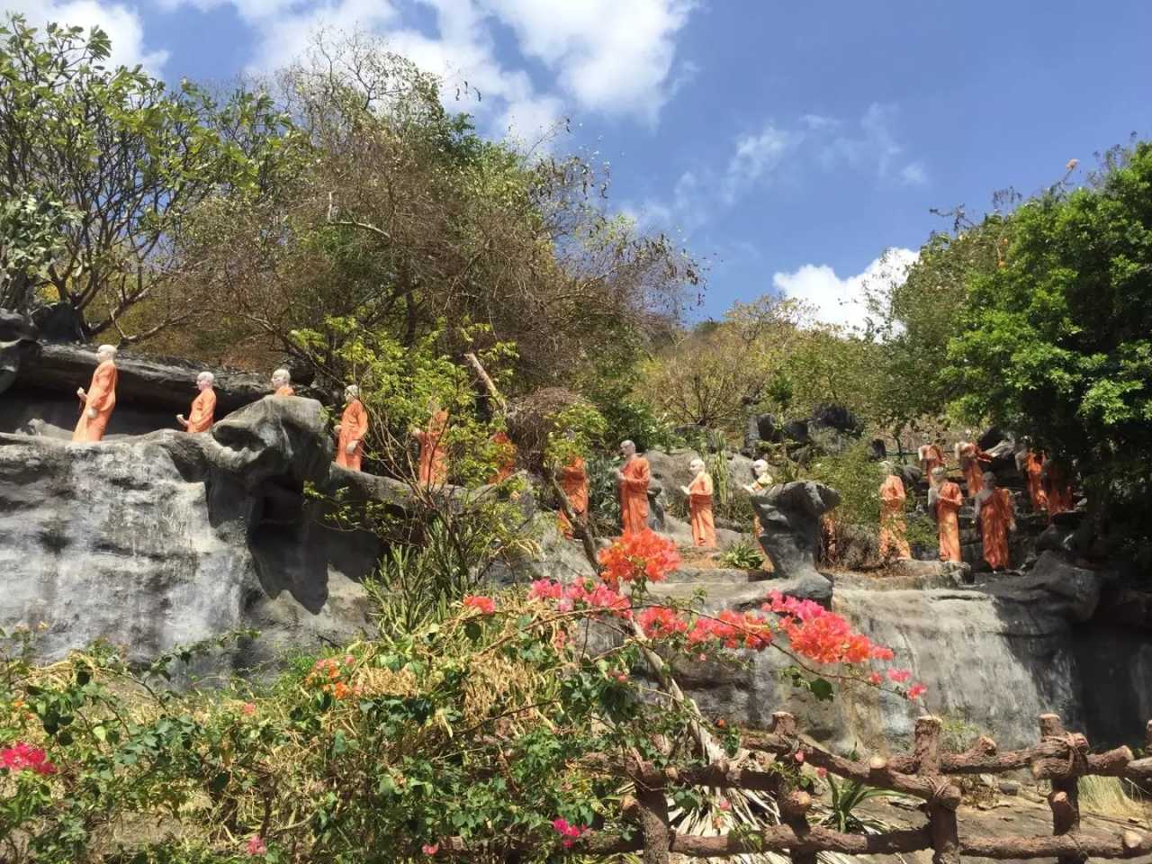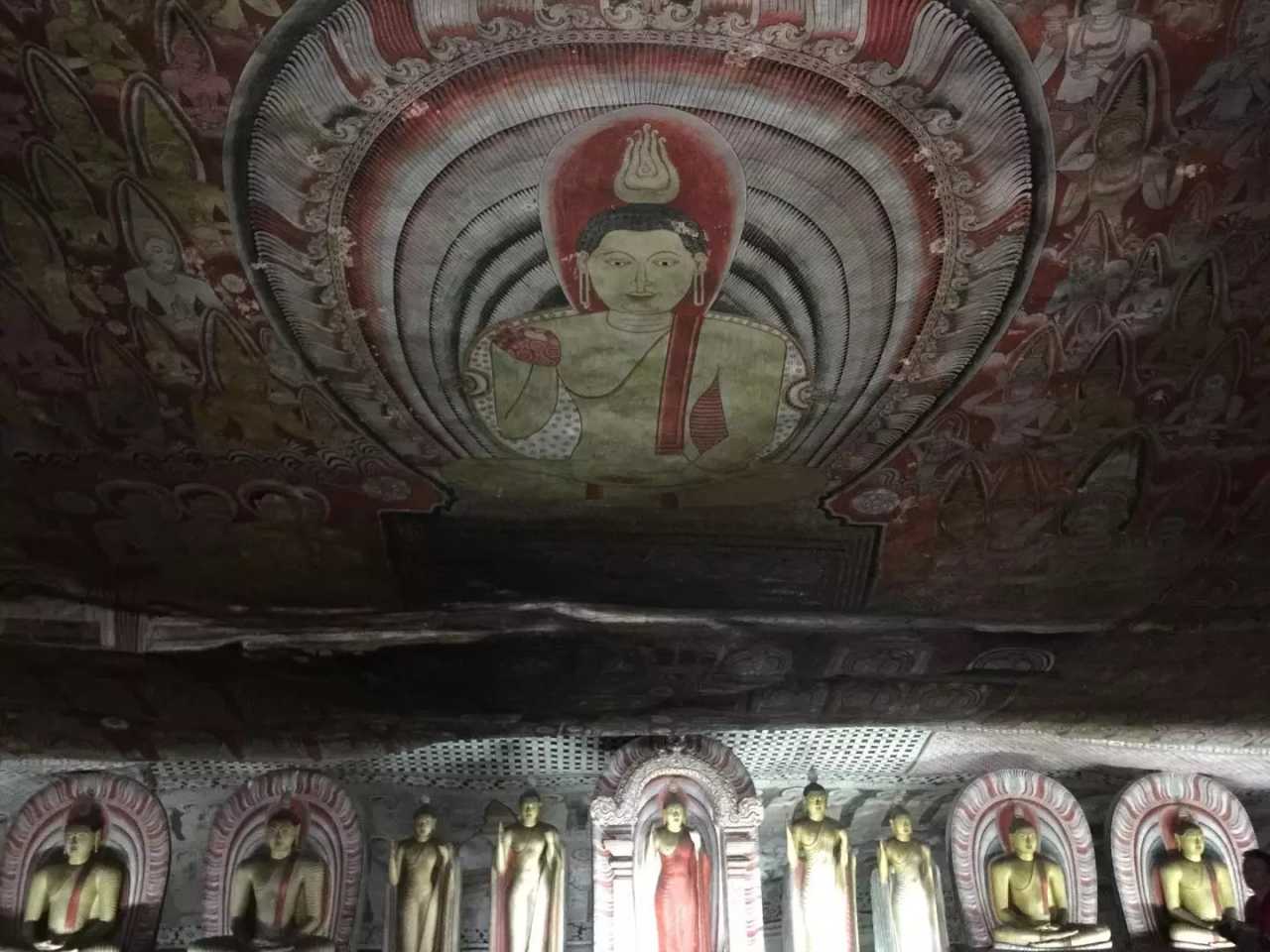 Monday, Sept 12: we set out at 10:00 for the Dambulla Cave Temple. In Buddhist temples you must remove shoes and hats, keep shoulders and knees covered, and never step on, straddle, or climb over Buddha images. There is a shoe deposit at the gate—25 LKR per pair, no change given. Dambulla sits in central Sri Lanka, 149 km northeast of Colombo and about 60 km north of Kandy. The cave temple, founded in the 1st century BCE, is a major pilgrimage site, carved into a giant rock south of Dambulla town, with over 2,000 years of history. It is Sri Lanka’s best‑preserved cave temple complex, famed for murals and statues. The complex comprises five shrines. Cave 1 houses a 14‑meter reclining Buddha with Ananda at his feet and an image of Vishnu above the head—hence it is called the “Devaraja Lena.” Cave 2, the largest, contains 16 standing Buddhas, 40 seated Buddhas, two Hindu deities (Vishnu and Saman), and statues of kings Vattagamani and Nissanka Malla; a small stupa stands within. A spring in the cave strangely appears to flow upward along a fissure and drips day and night—believers call it sacred water. Cave 3, the “Maha Alut Viharaya,” features 17th‑century Kandyan‑style paintings and a statue of King Kirti Sri Rajasinha (1747–1782), who revived Buddhism. Cave 4 is smaller, with a single seated Buddha; its stupa was once looted. Cave 5 was a storeroom and now holds a giant reclining Buddha with many Hindu deities beside him. The murals are extraordinary—geometric patterns on the ceilings and richly colored walls—most in excellent condition.