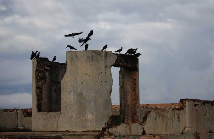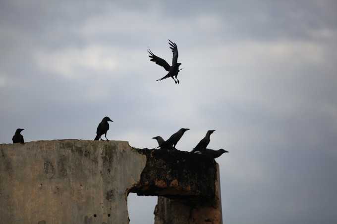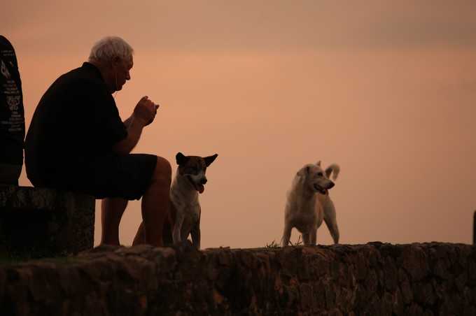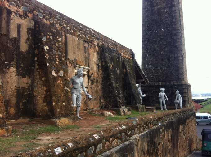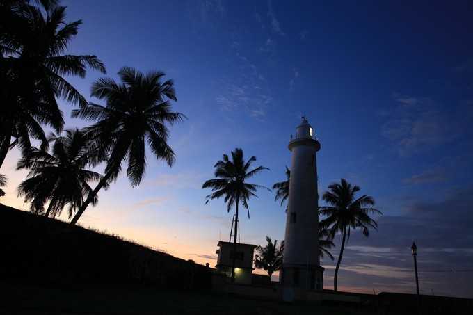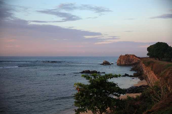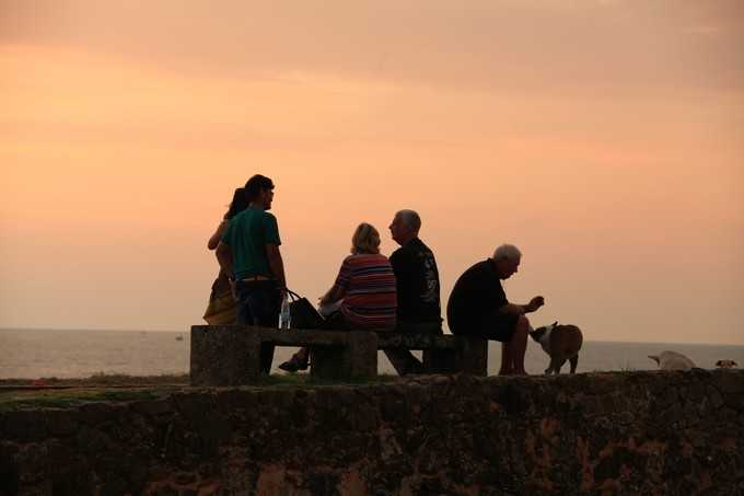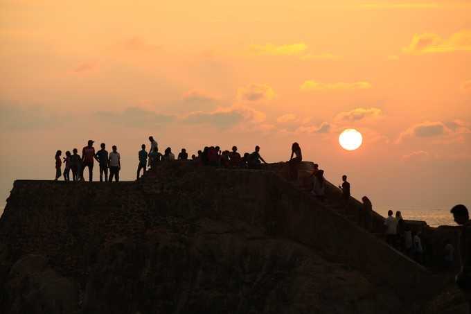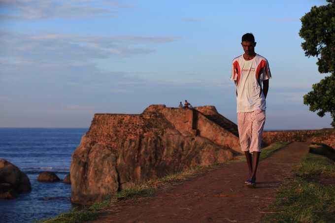 Galle Fort was built by the Portuguese in 1505. In sunset glow its ruined walls shine over green lawns; anything living becomes the scene’s protagonist.