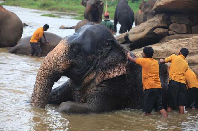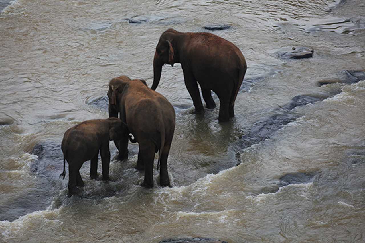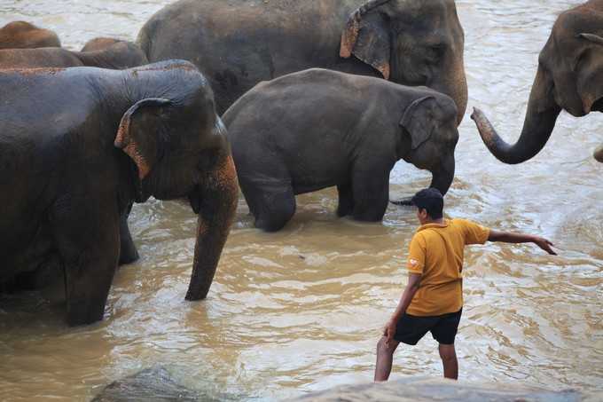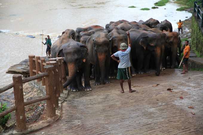 Several hotels tip the mahouts, who split the herds and bring them to the riverbed below the terraces for bathing.