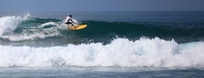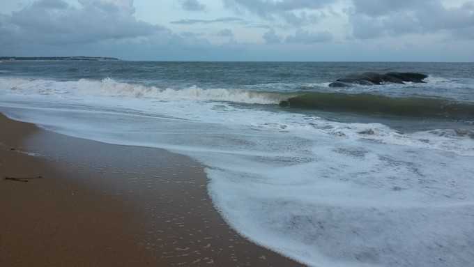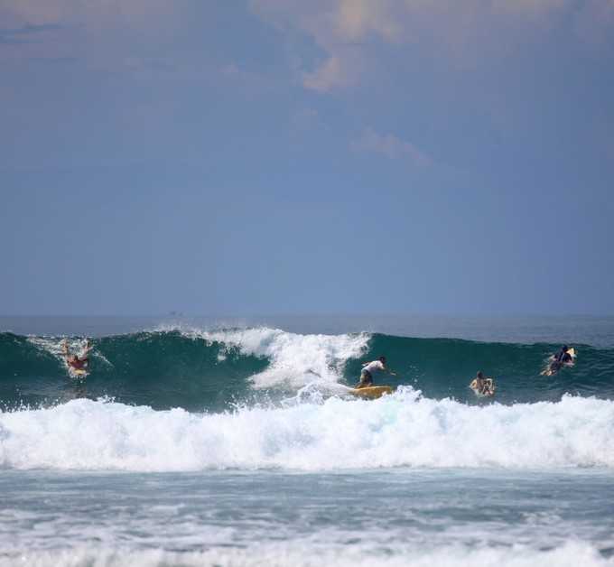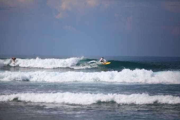Waves are still sizable, but the seabed is shallow for hundreds of meters—great for surfing practice; even lying on a board to ride waves is fun.