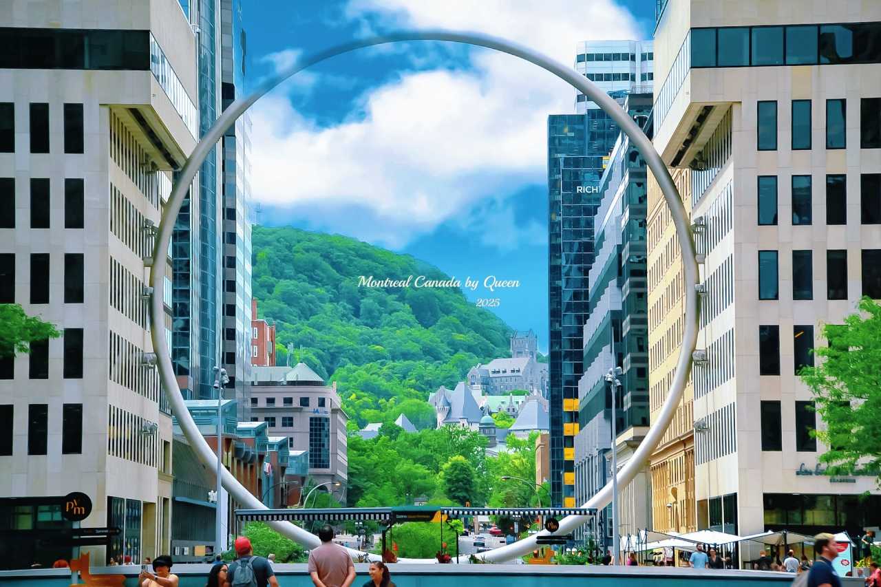 Among these buildings, there is also one of Montreal's most eye-catching new landmarks - The Ring. A huge metal ring with a diameter of 30 meters, suspended in the air, installed in the Esplanade Place Ville Marie square in the city center, designed by the local art institution Moment Factory. The Ring doesn't have too many decorations, just a clean, minimalist geometric circle, but it creates a visual pause and blank space between the city's high-rise buildings.