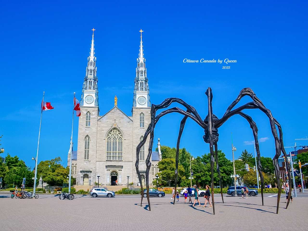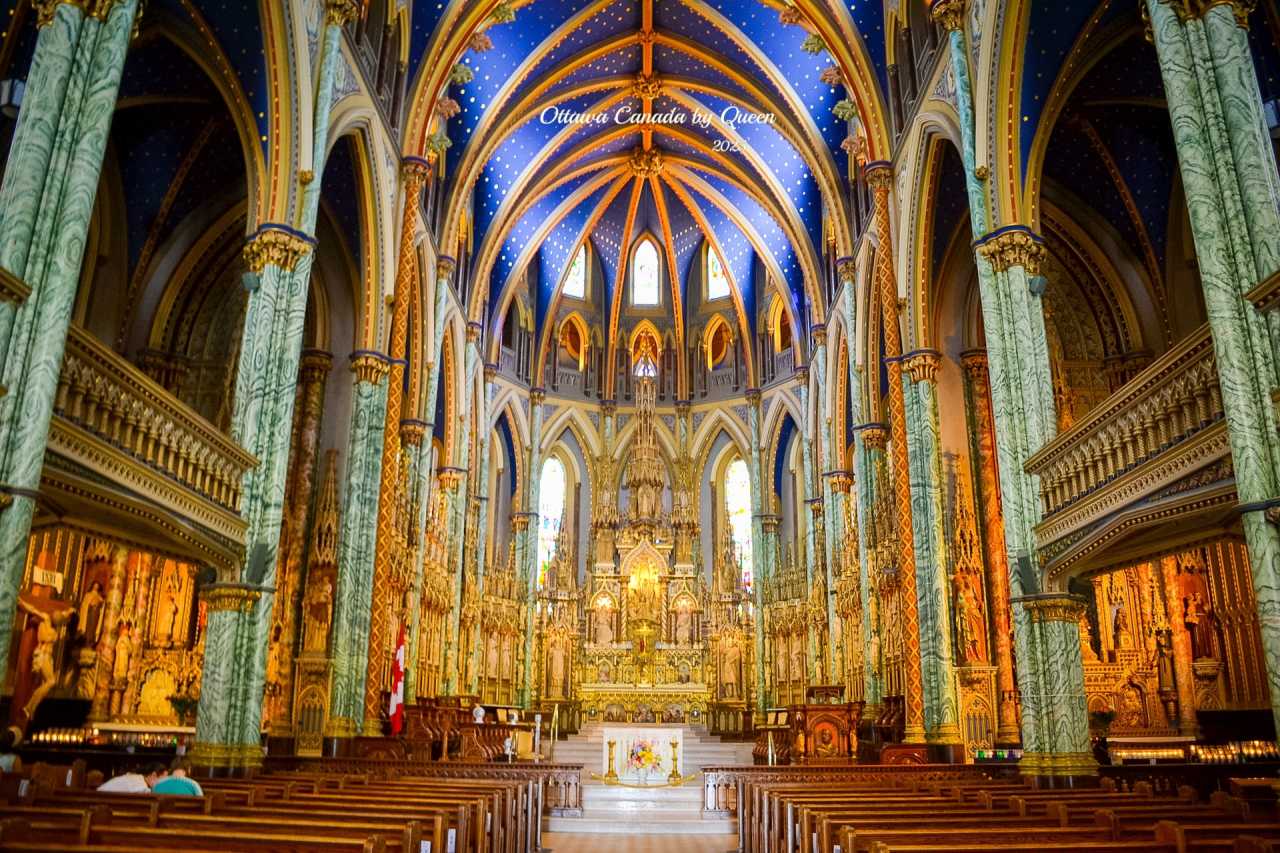 Walking across from the spider's shadow, one's gaze is involuntarily drawn to another landmark - Ottawa's oldest and most solemn church: Notre-Dame Cathedral Basilica. Her twin towers shimmer with silver light under the sun, with Gothic spires, rose windows, and blue-gold interior ceiling, exuding an almost gentle sense of sanctity.