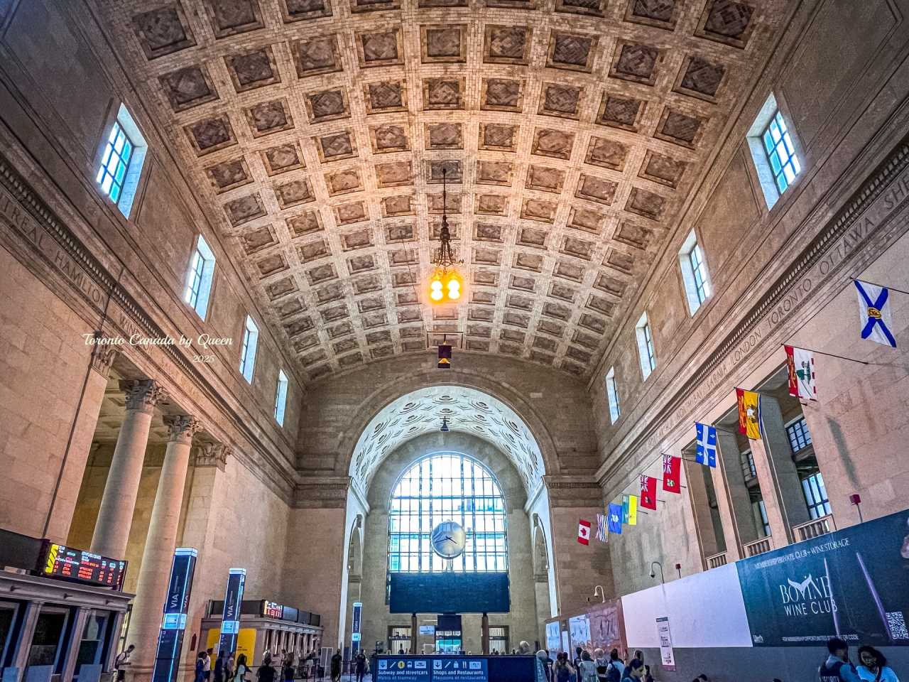 The exterior facade of the station adopts the design language of neoclassicism: a row of 56 tall Doric columns supports the main facade, combined with limestone material, making the entire building appear solemn, steady and eternal. The ceiling of the lobby inside the station is towering, the windows are arched, the floor is made of mosaic parquet, the details are exquisite, full of historical sense. There are also exquisitely carved relief texts at the top of the hall, recording important cities in Canadian railway history.