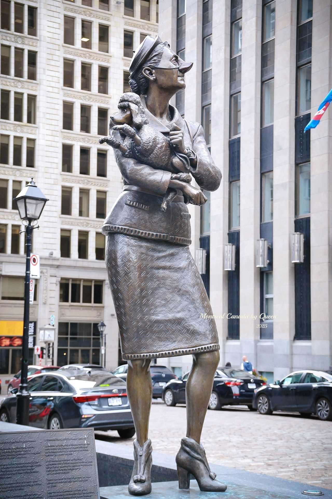 In front of the cathedral in Place d'Armes, there are two masked men holding dogs, part of a group of six realistic bronze figures created by Fortier, representing ordinary citizens of Montreal in different eras, vivid and lifelike.