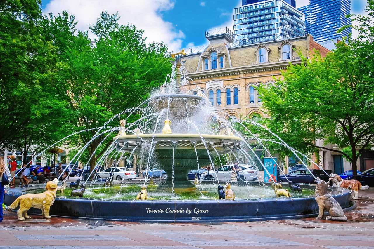 Walking a few steps further south, I came to an unexpected corner - Berczy Park. This is a small street-side park, but it has the cutest fountain in the whole city. Dozens of dog statues in various poses surround the central water column in a circle, some jumping, some looking up, some tilting their heads and acting cute, all eyes focused on the golden "bone" in the middle. The dogs really spray water from their mouths, looking like they are joyfully chasing. No matter how bad your mood is, seeing this fountain will make you unconsciously smile. The seriousness of the city is completely dissolved here, replaced by a childlike sense of humor.